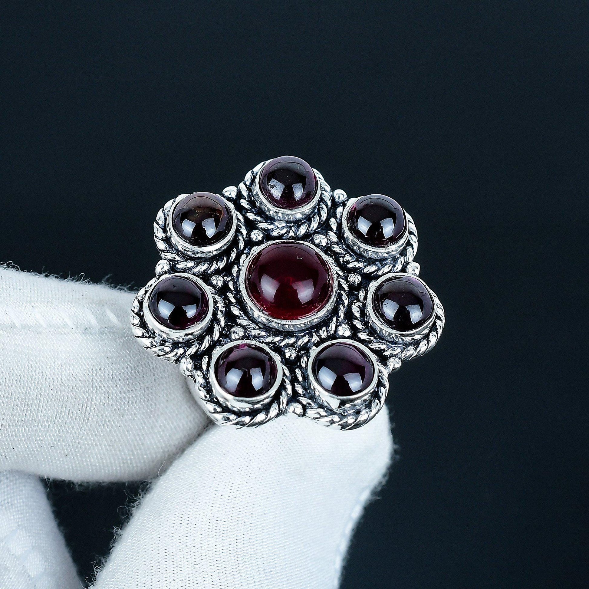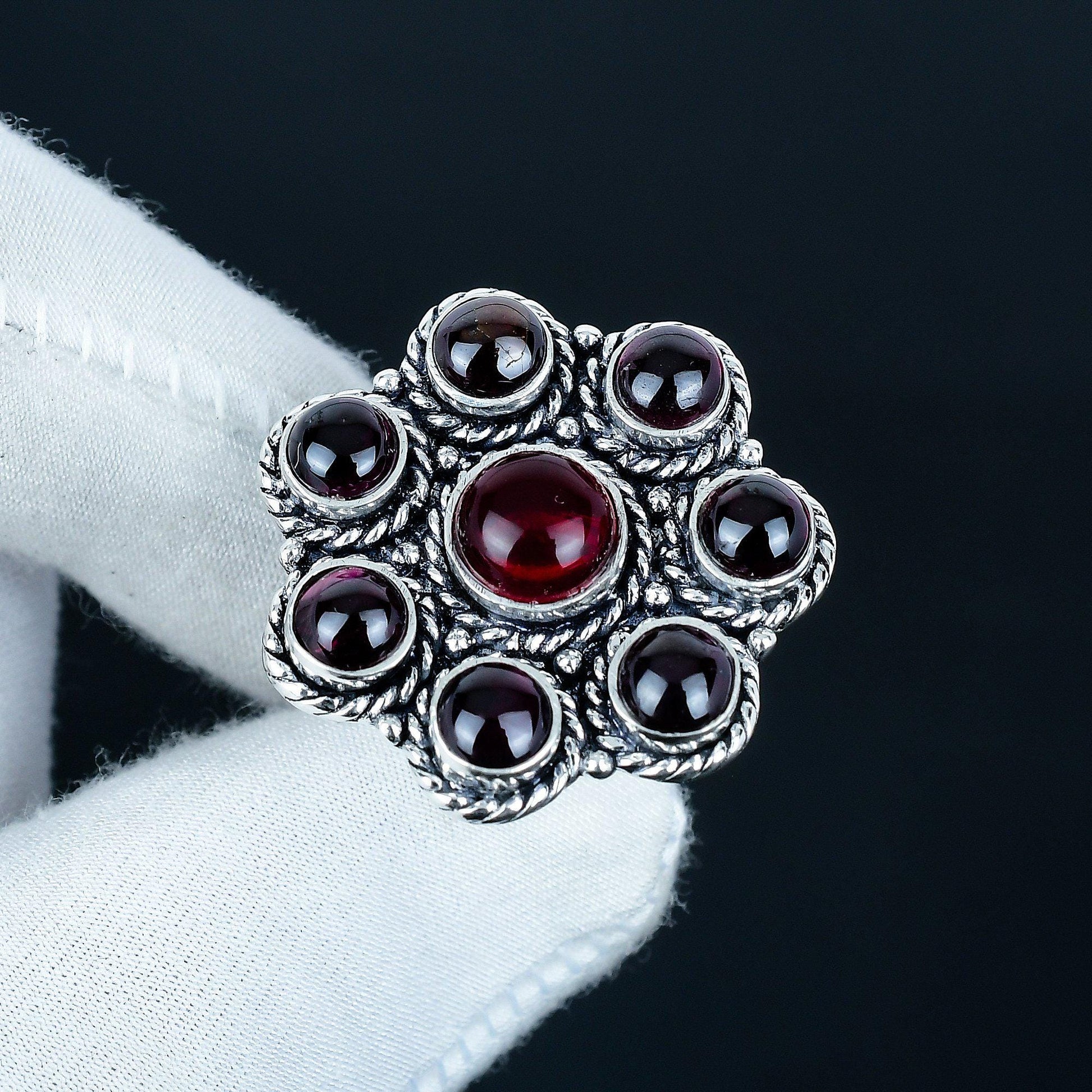 This stunning piece features seven deep garnet-red gemstones, set in intricate ornate silver, capturing the essence of classic sophistication.