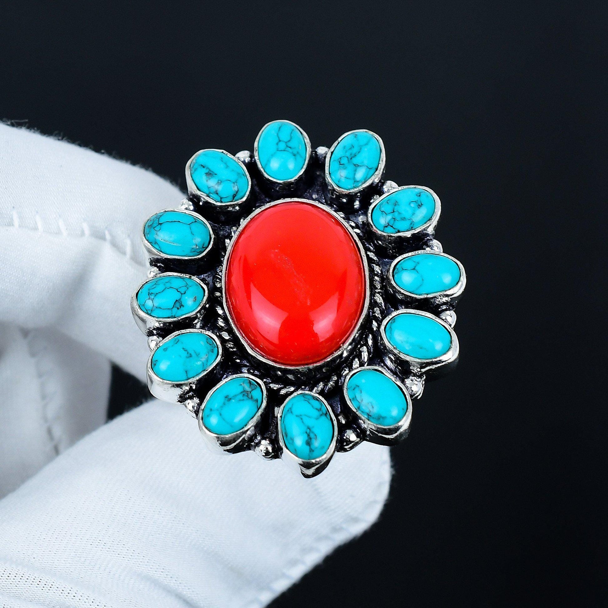 Design: The ring features a striking red oval gemstone at its center, surrounded by a halo of vibrant turquoise stones.