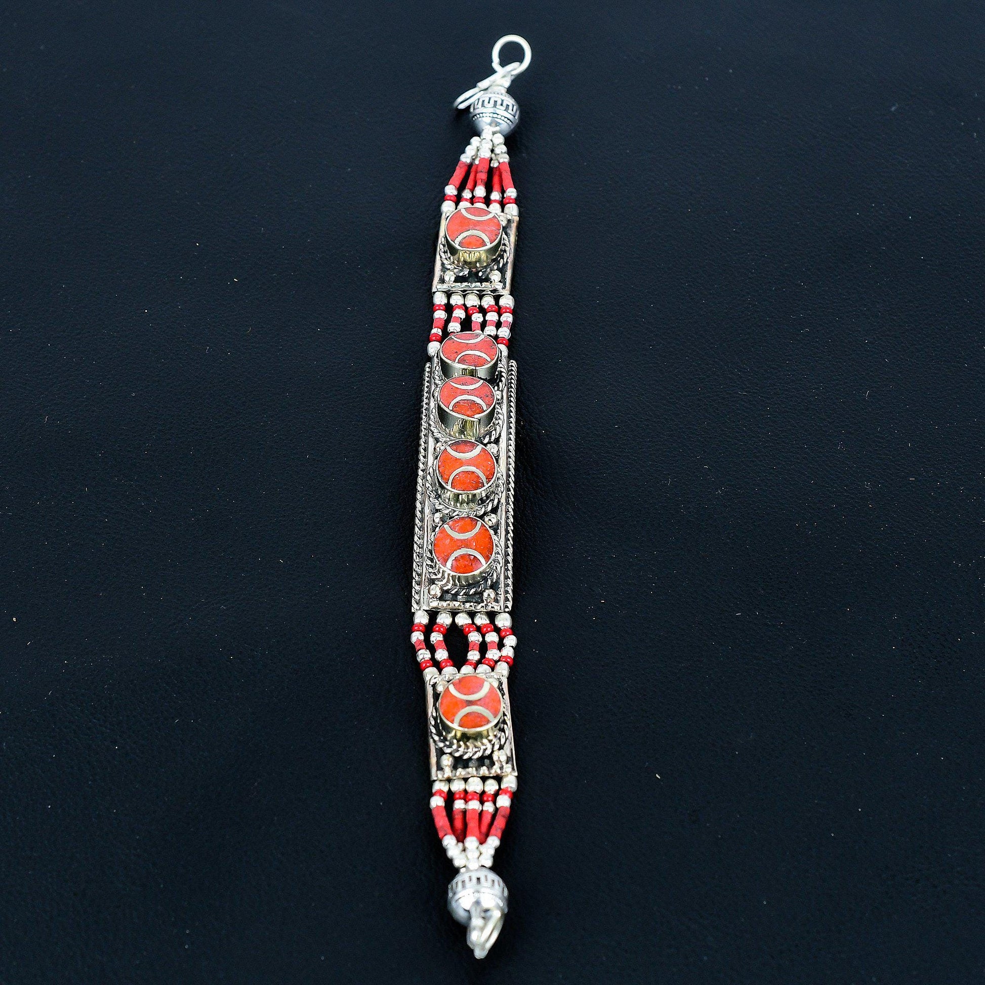 - Design: This bracelet features a unique combination of intricate silver detailing with vibrant red beads and ornate crescent motifs, adding a distinctive touch to any outfit.
