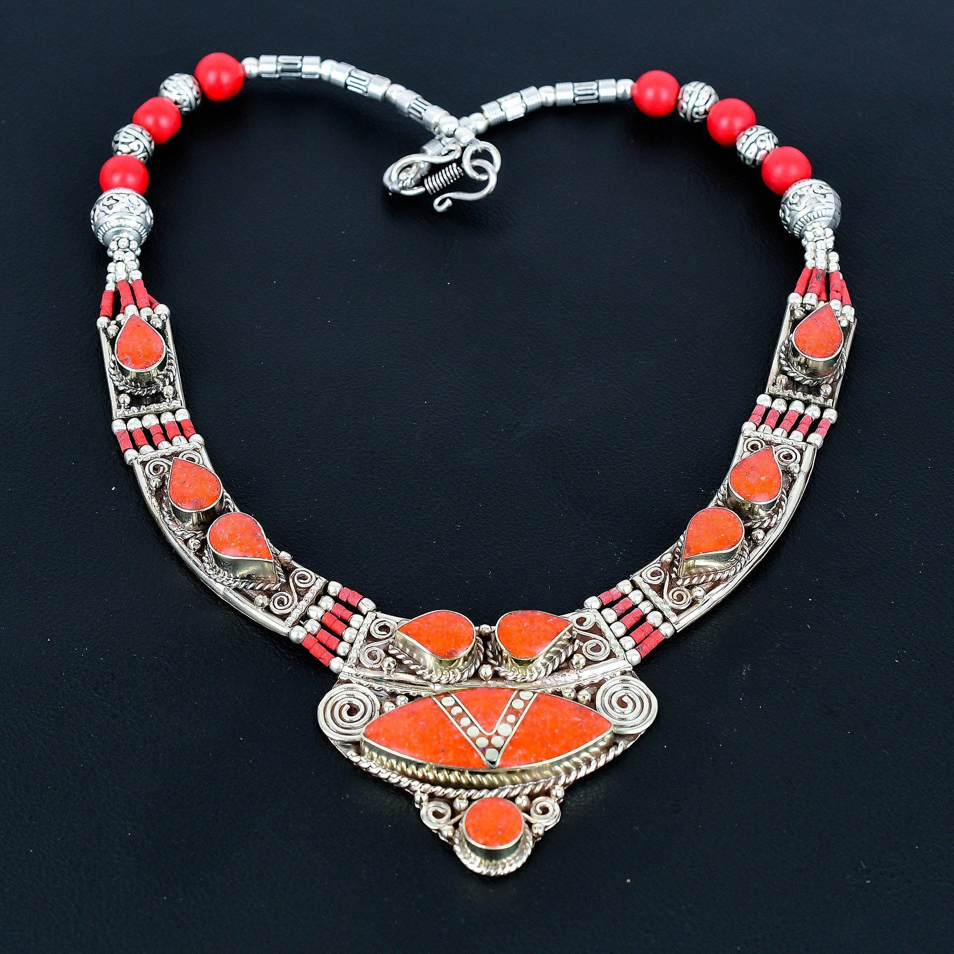 Experience the elegance of our handcrafted statement necklace, featuring vibrant coral-colored stones set in intricate silver-toned metalwork.