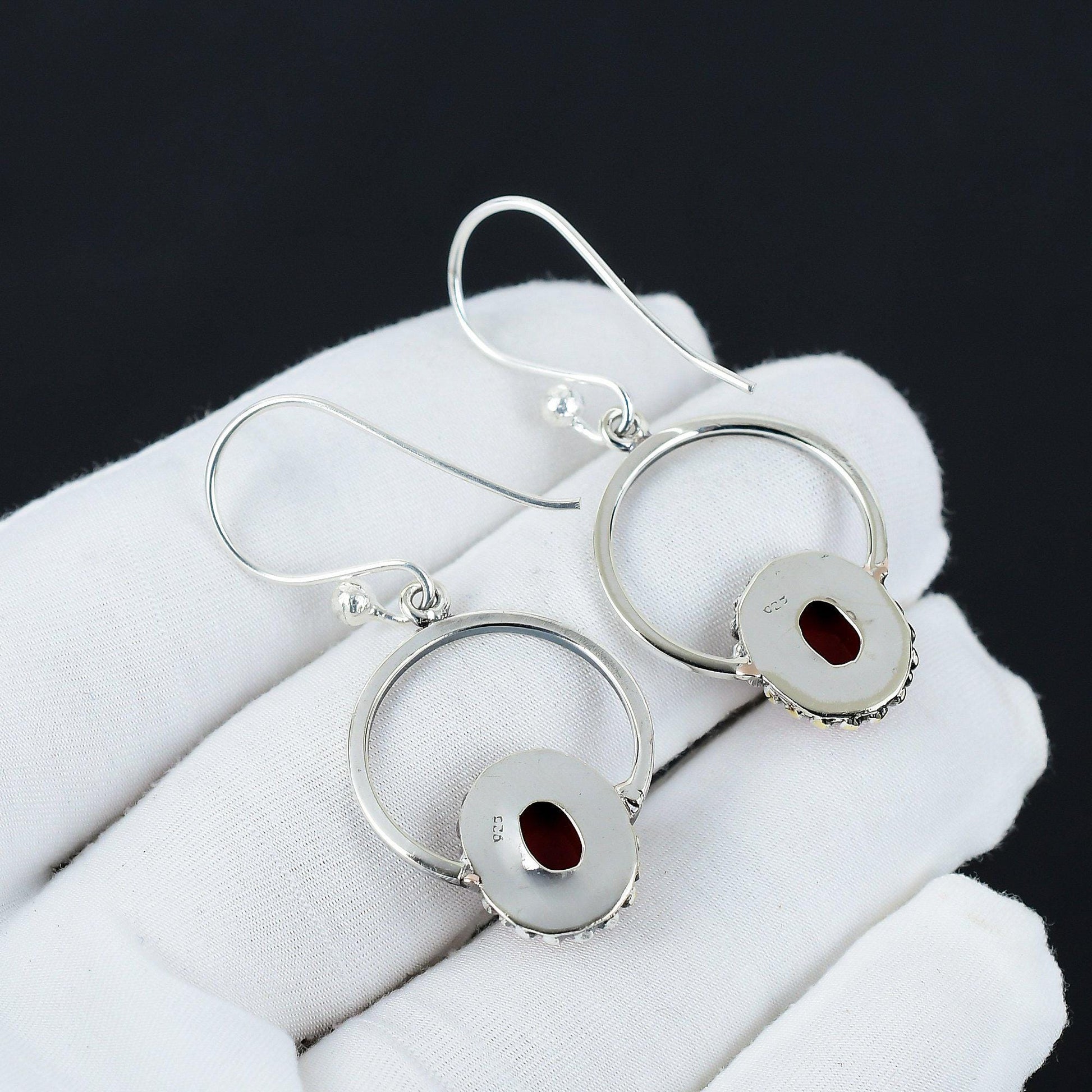 Elevate your style with these stunning red stone earrings. Perfect for adding a pop of color, each earring features a vibrant red gem encased in a filigree design. The classic round silver-toned hoop enhances its elegance and provides a timeless look.
