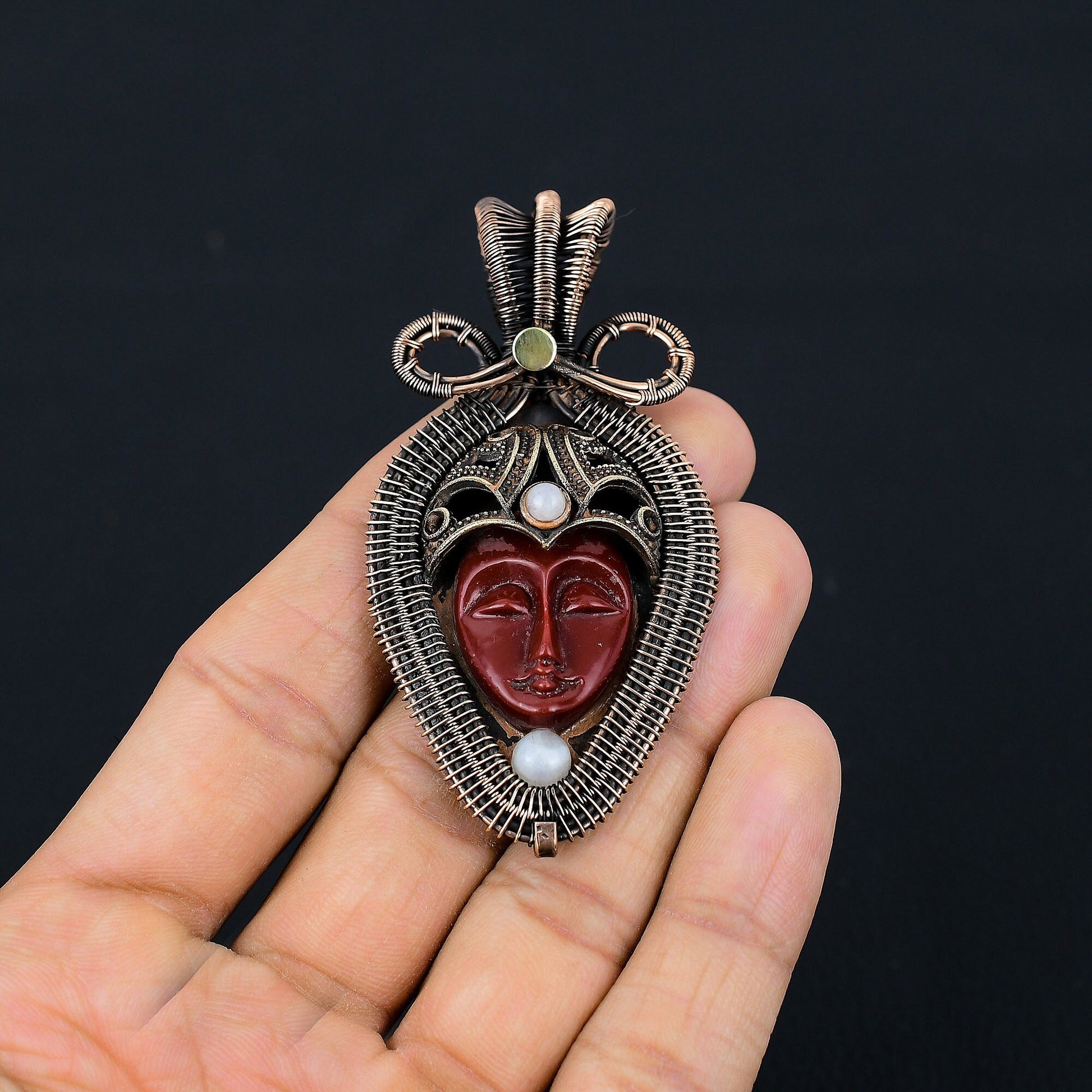 Embrace the allure of ancient artistry with this exquisite handcrafted pendant. Featuring a striking face design carved in deep crimson stone, this piece is framed by intricately woven metalwork that exudes a timeless elegance.