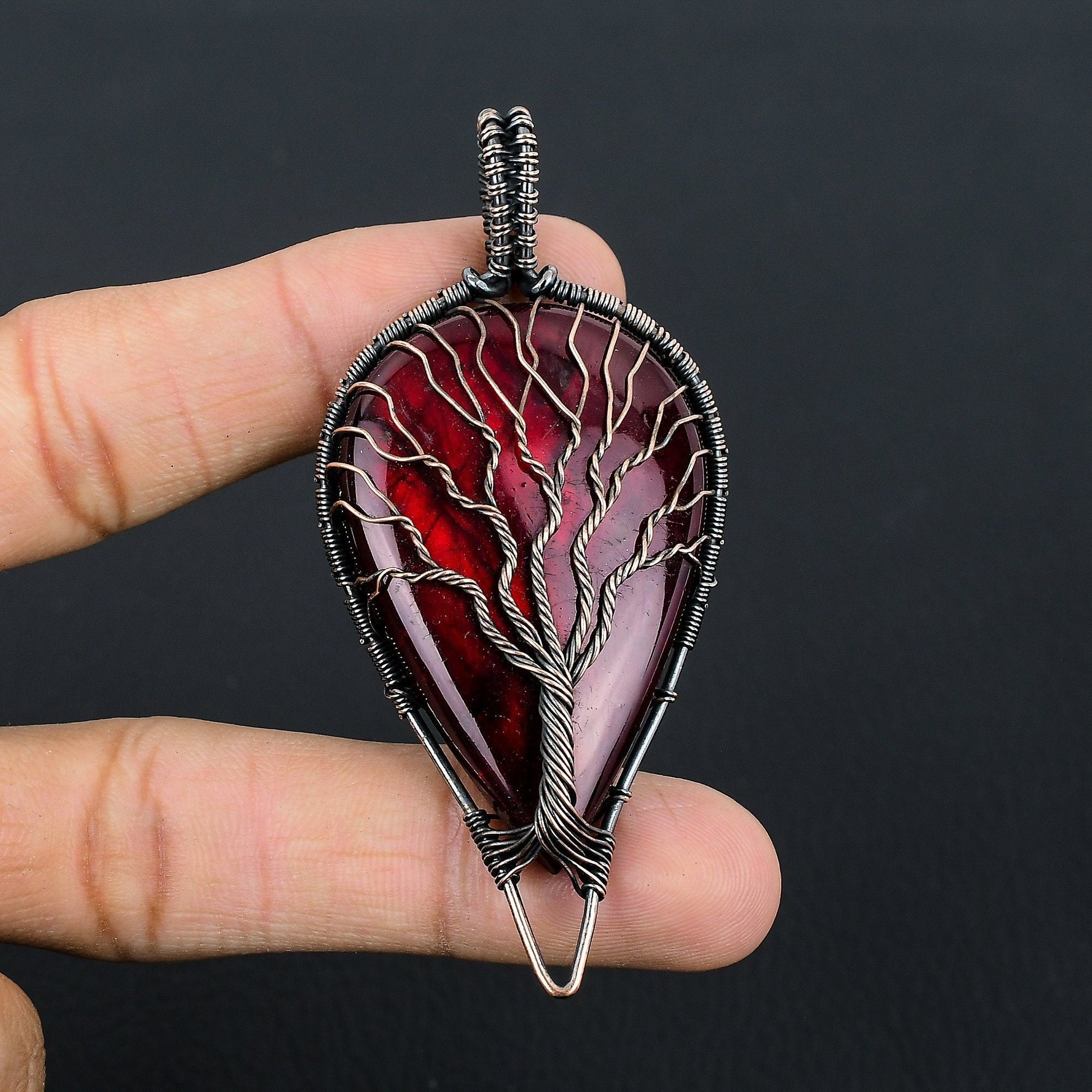 This exquisite piece features an intricate tree motif encased in a deep, rich crimson teardrop stone. The delicate wire work complements the vivid colors, creating a harmonious blend of elegance and earthiness.