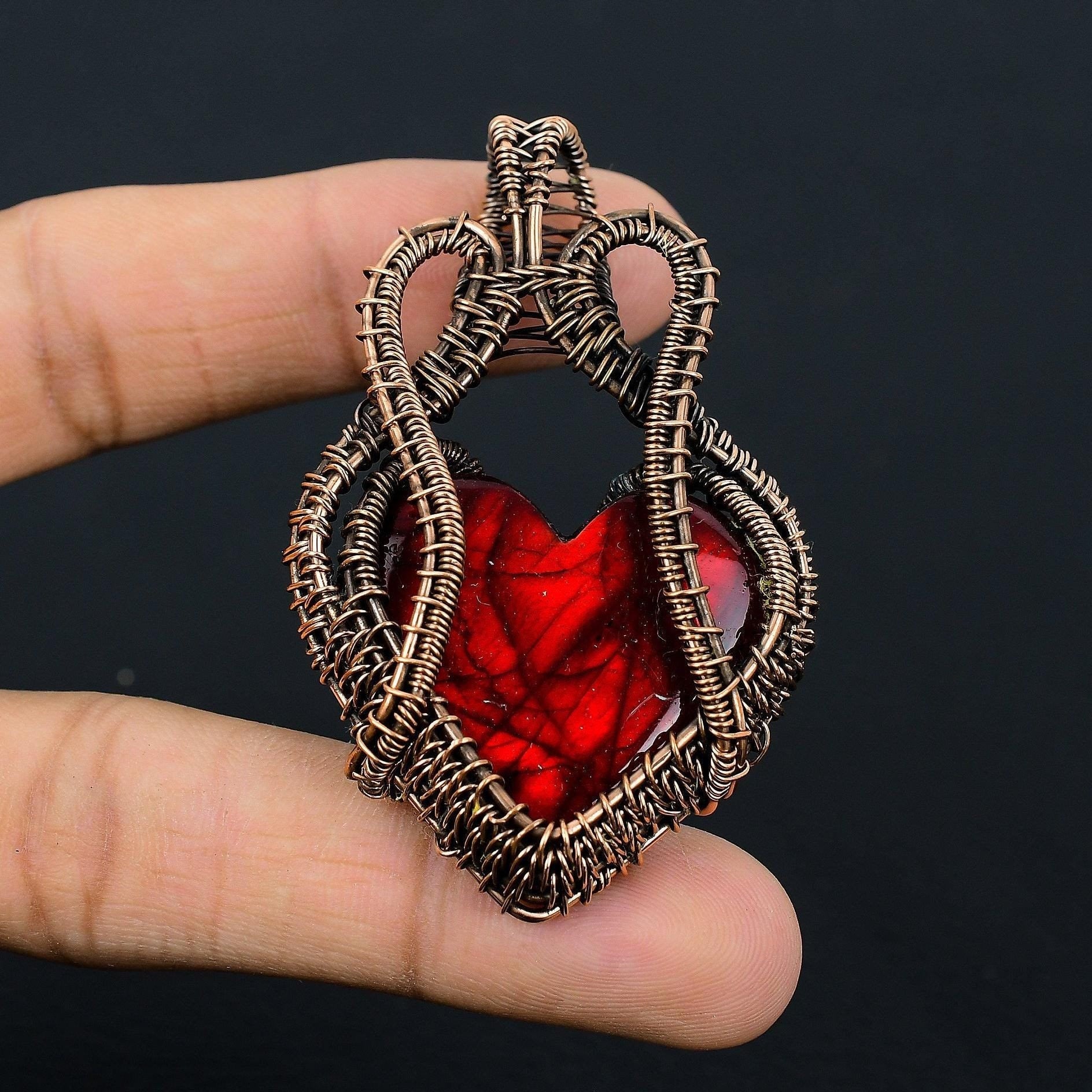 The intricate wire wrapping creates a delicate and unique frame, highlighting the vivid colors and natural beauty of the heart-shaped centerpiece.
