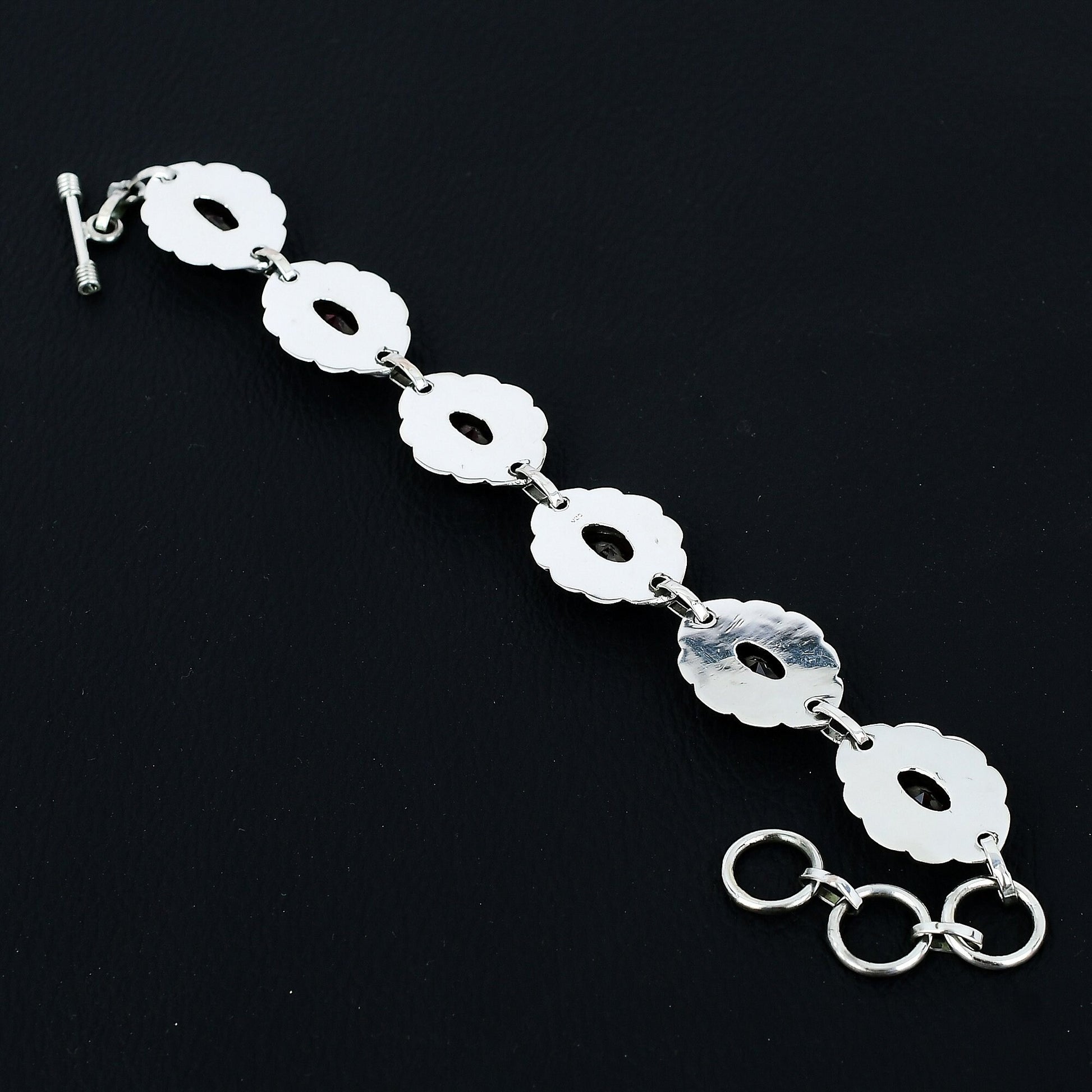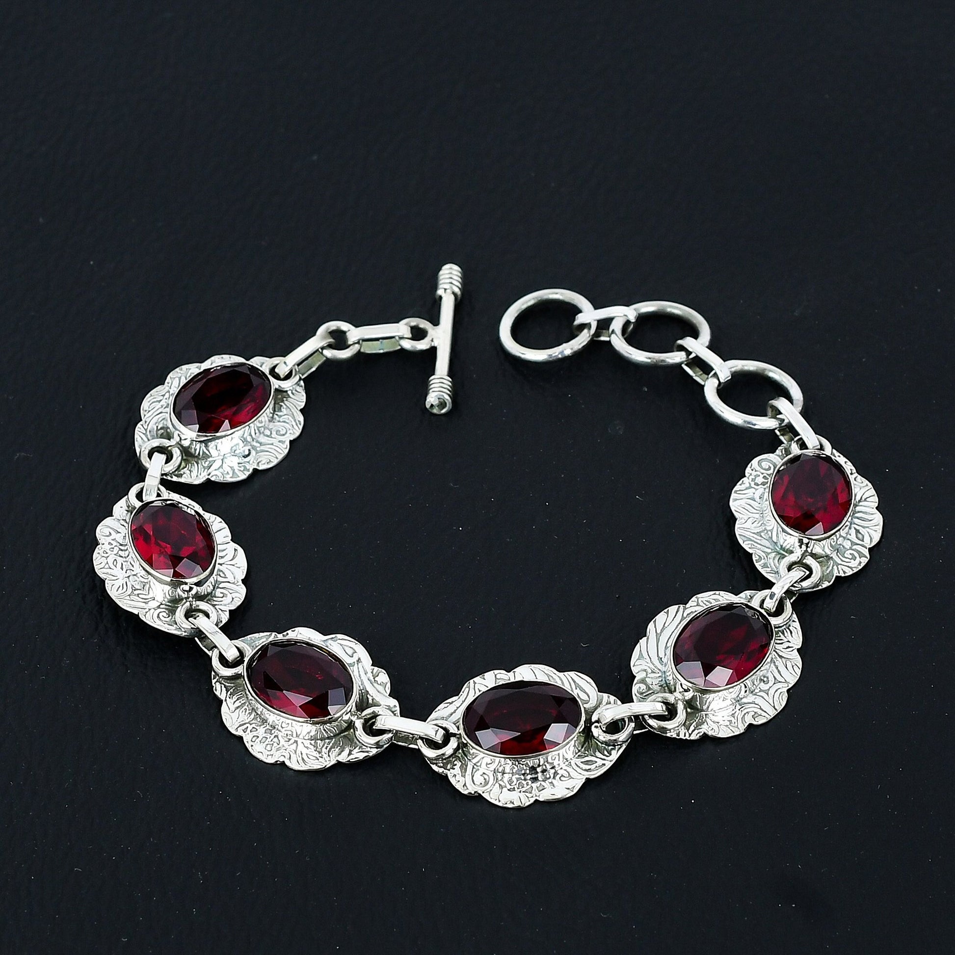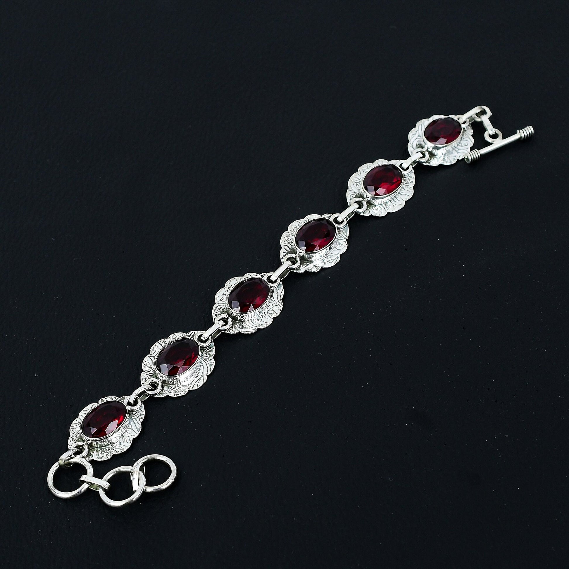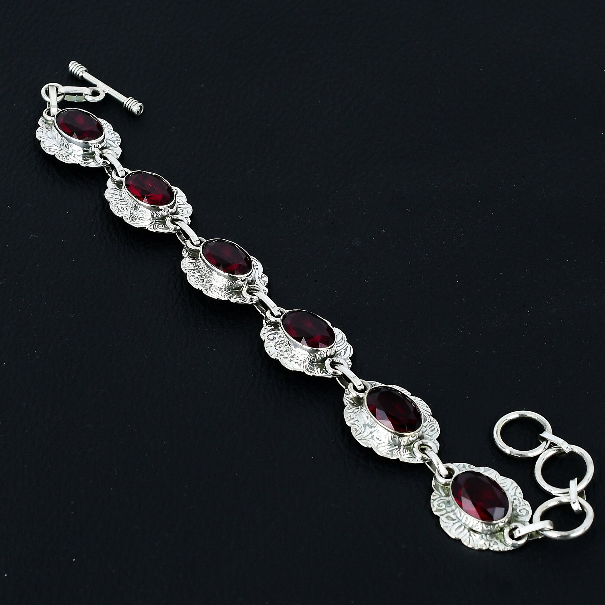 This stunning piece features vibrant red ruby stones, each set in intricately designed sterling silver links.