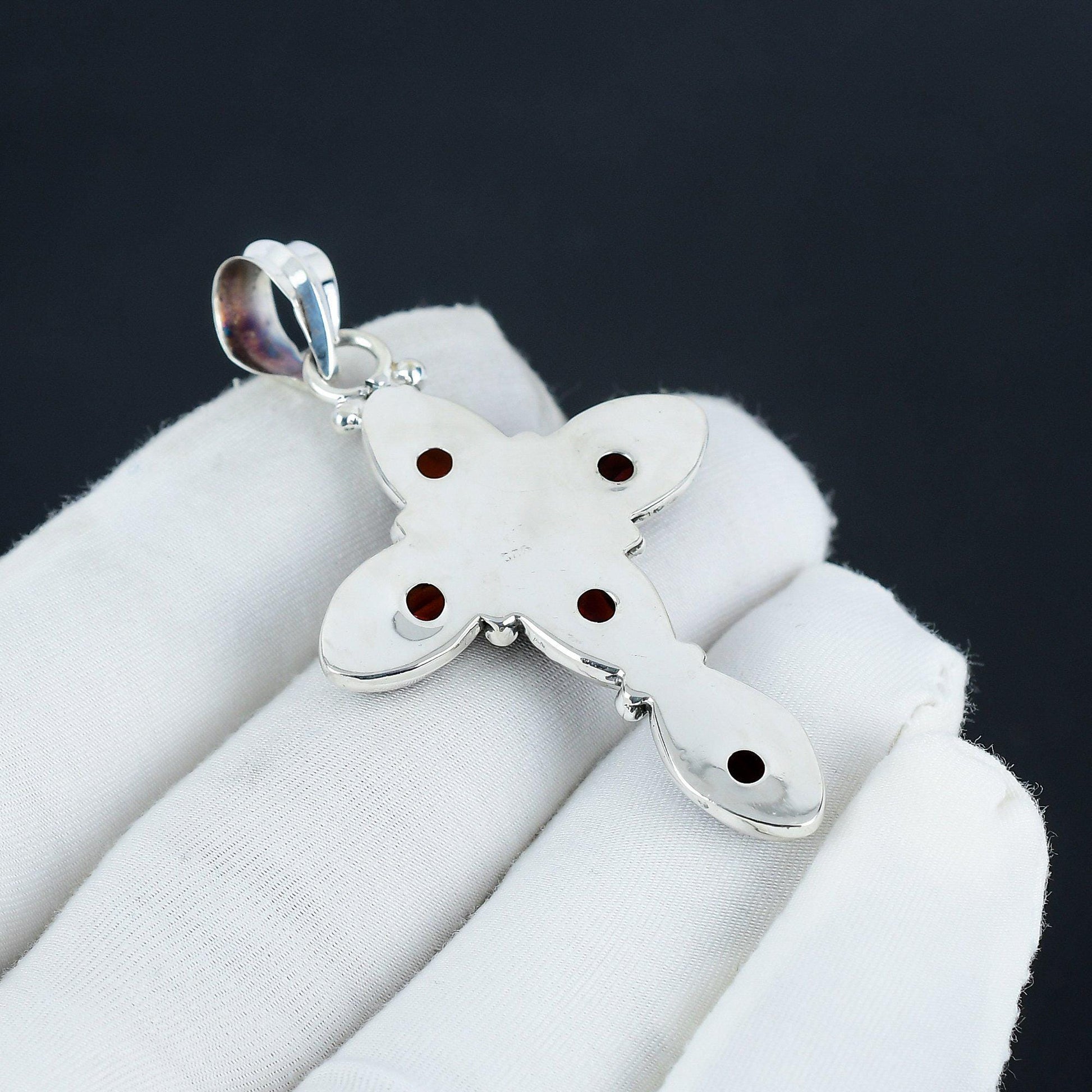 This stunning piece showcases five marquise-cut garnet gemstones, set in a unique cross design.