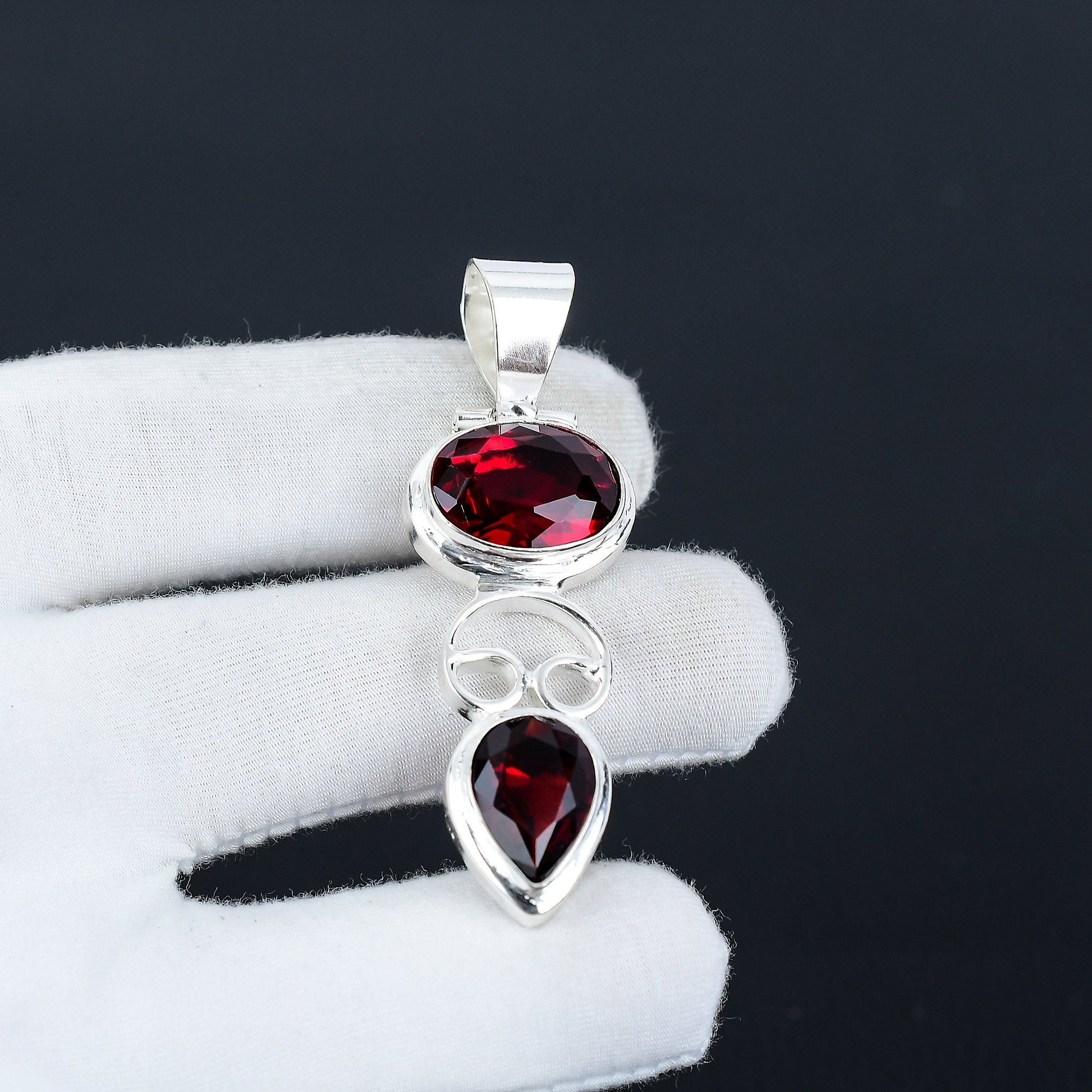 Elevate your style with this exquisite pendant, featuring two stunning deep red gemstones set in polished sterling silver.