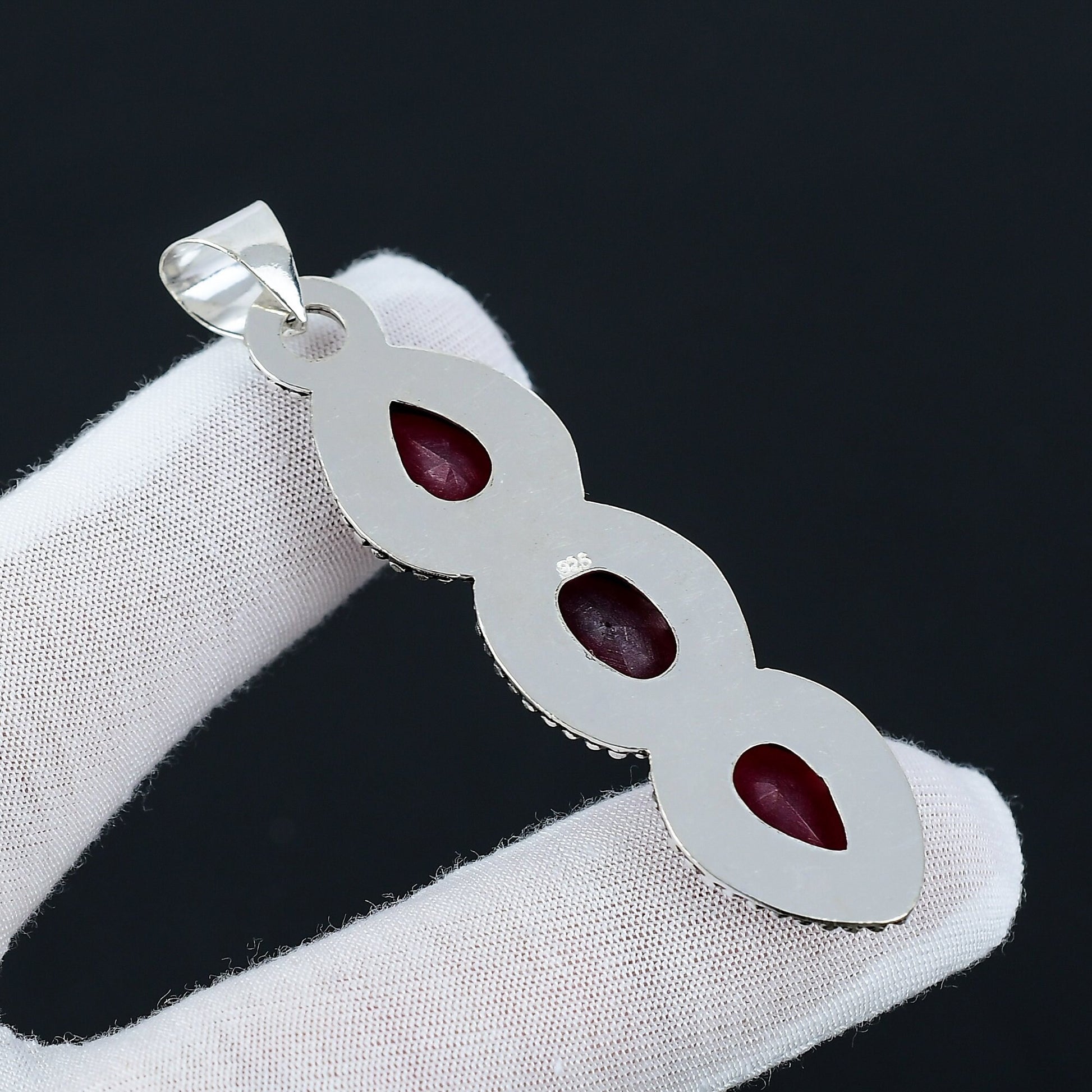 Enhance your elegance with this exquisite teardrop pendant, featuring three stunning deep red gemstones, each masterfully set in intricate silver-tone bezels.