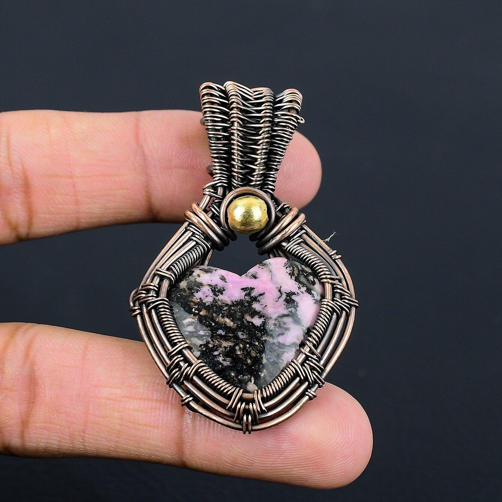 - Unique heart-shaped stone, elegantly encased in intricate copper wire weaving.