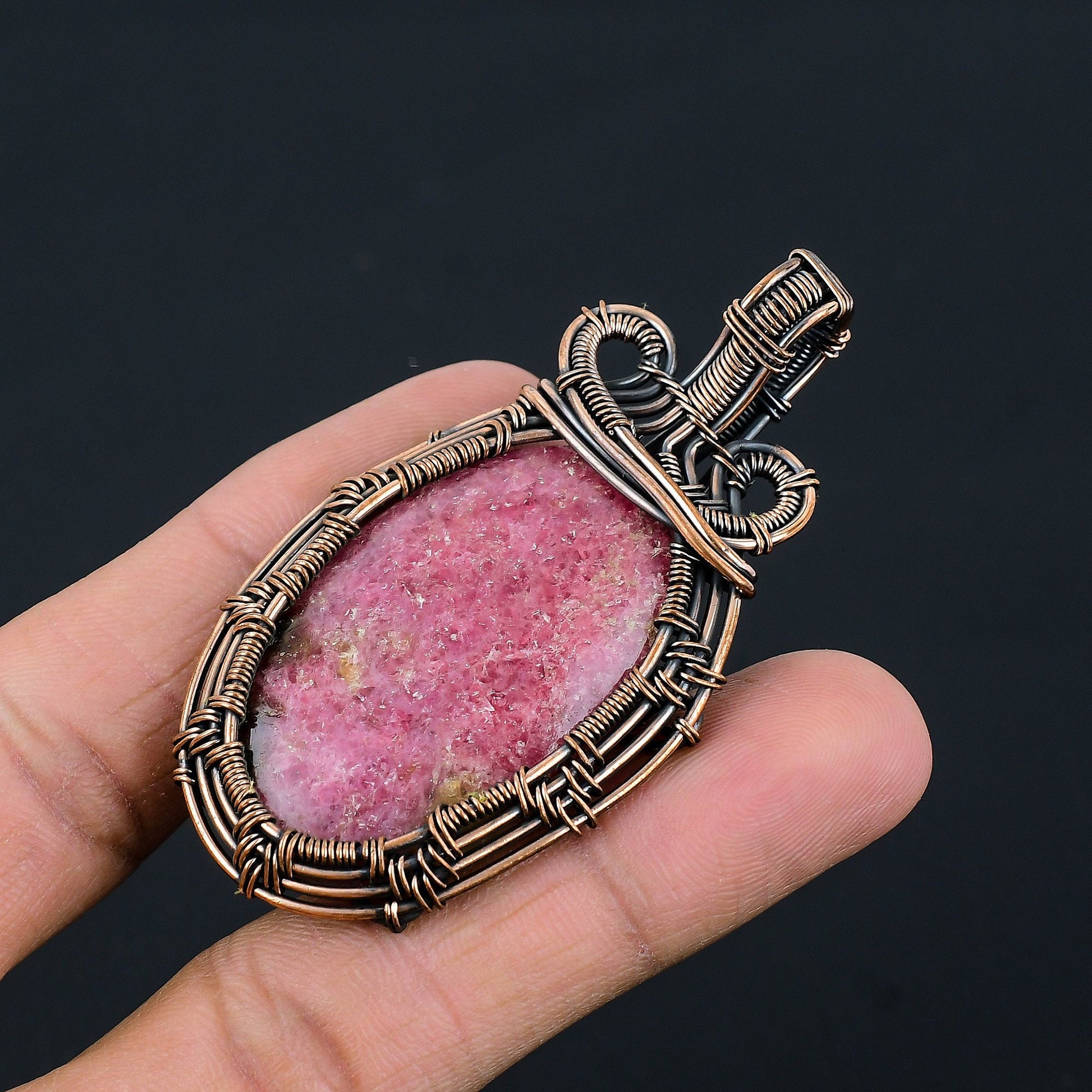Expertly wrapped in intricate wirework, this pendant showcases a unique blend of elegance and natural beauty. The striking pink hue of the stone is complemented by the warm tones of the wire, making it a versatile accessory for any occasion.