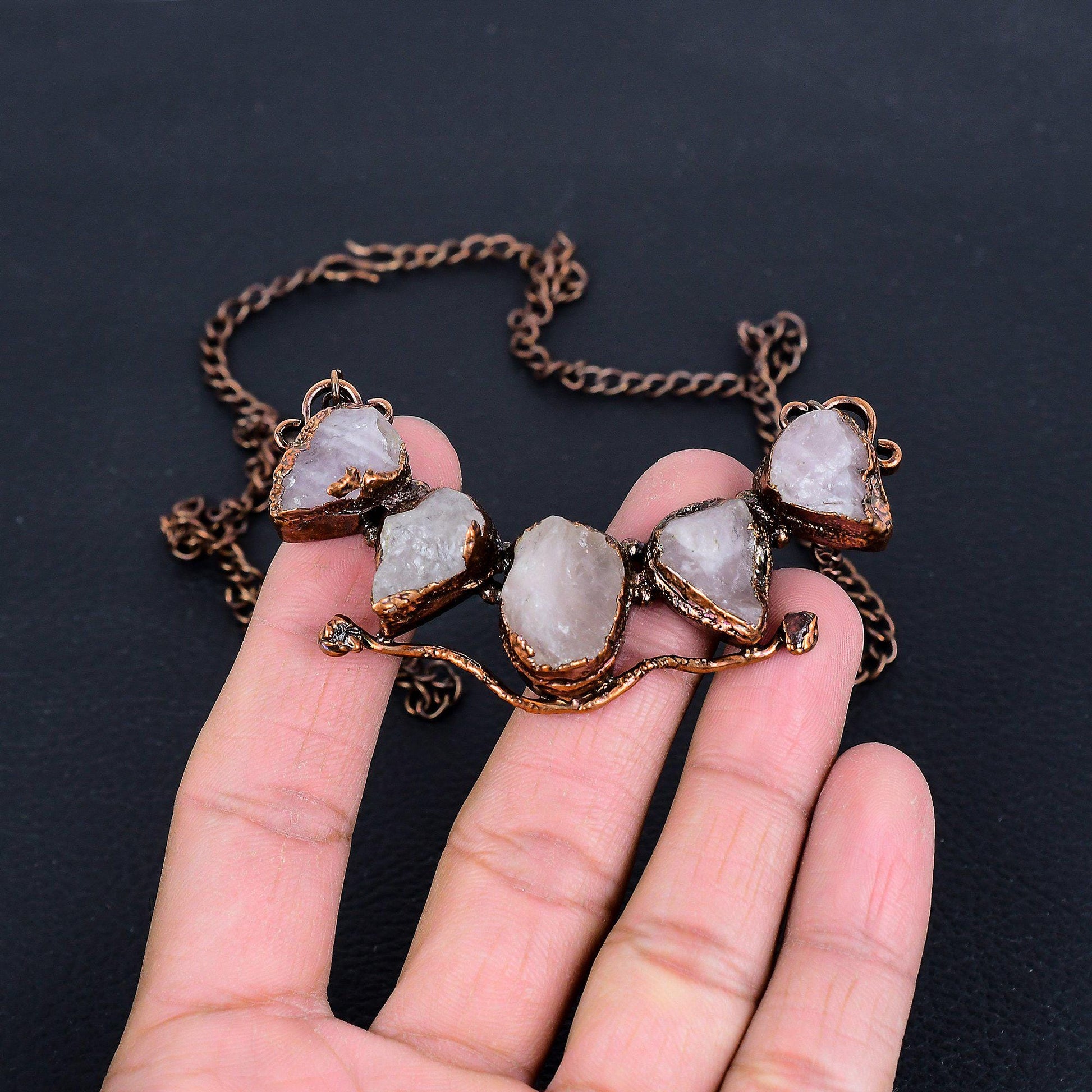 This unique piece features five raw stones, their natural textures and shapes celebrated in an elegant copper setting. Each stone is carefully selected for its natural beauty, creating a distinct and timeless accessory that complements any outfit.