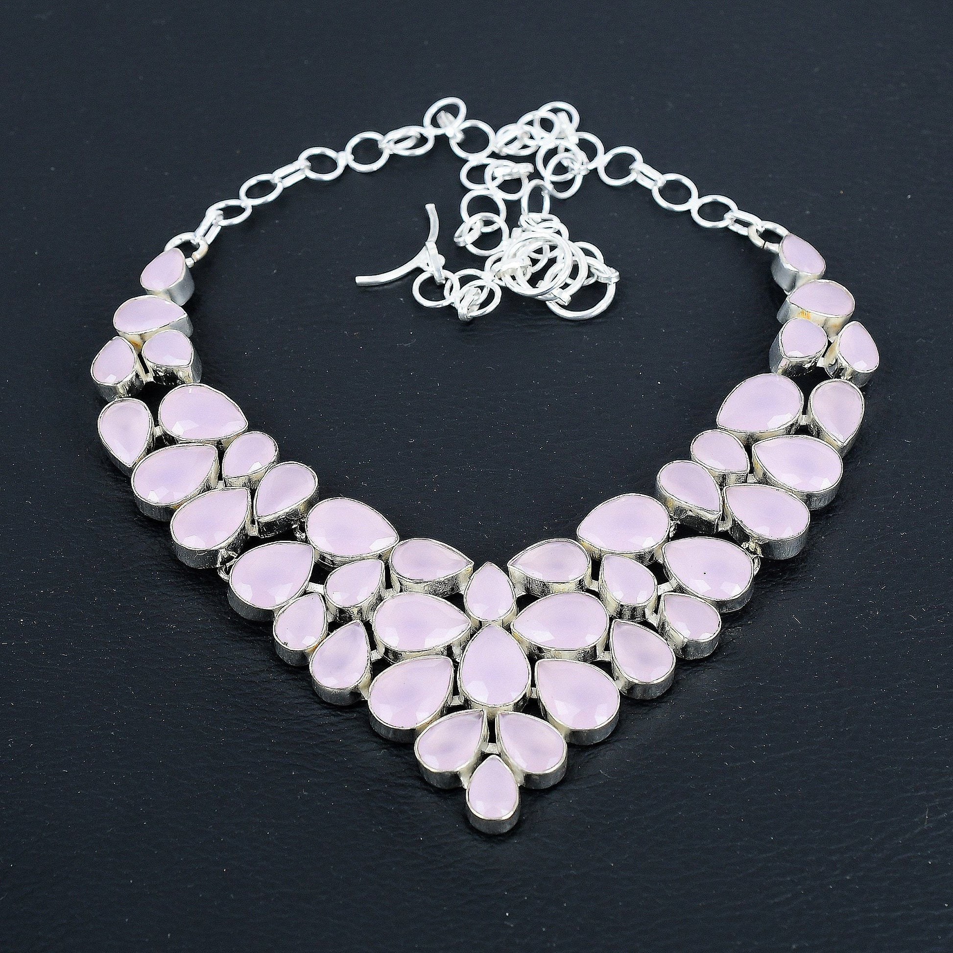 Design: The necklace features an intricate arrangement of soft pink gemstones, set in a high-quality silver-toned frame, offering a delicate yet bold appearance.