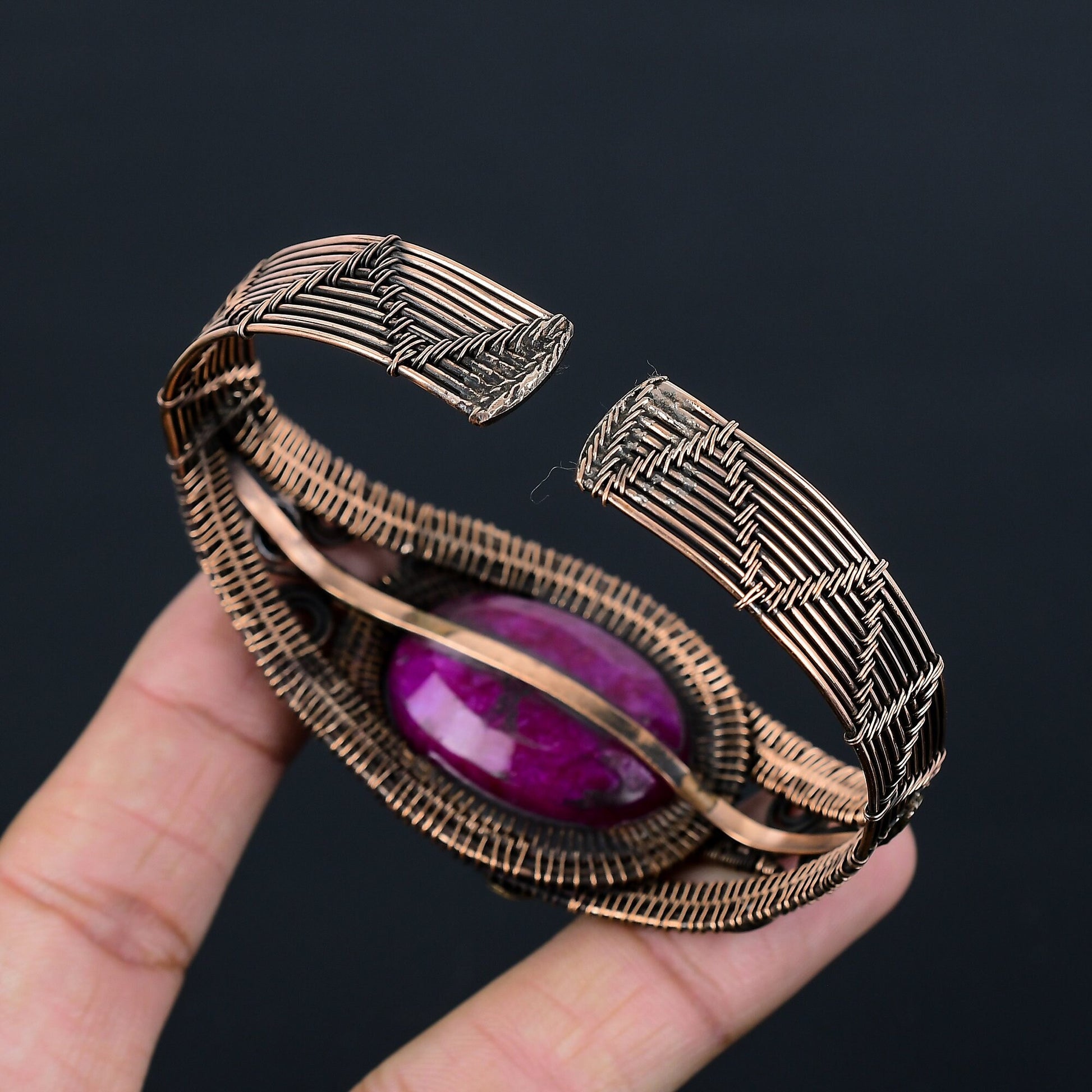 This stunning piece features a vibrant magenta stone, meticulously wrapped in intricate copper wire patterns that showcase both skill and creativity.