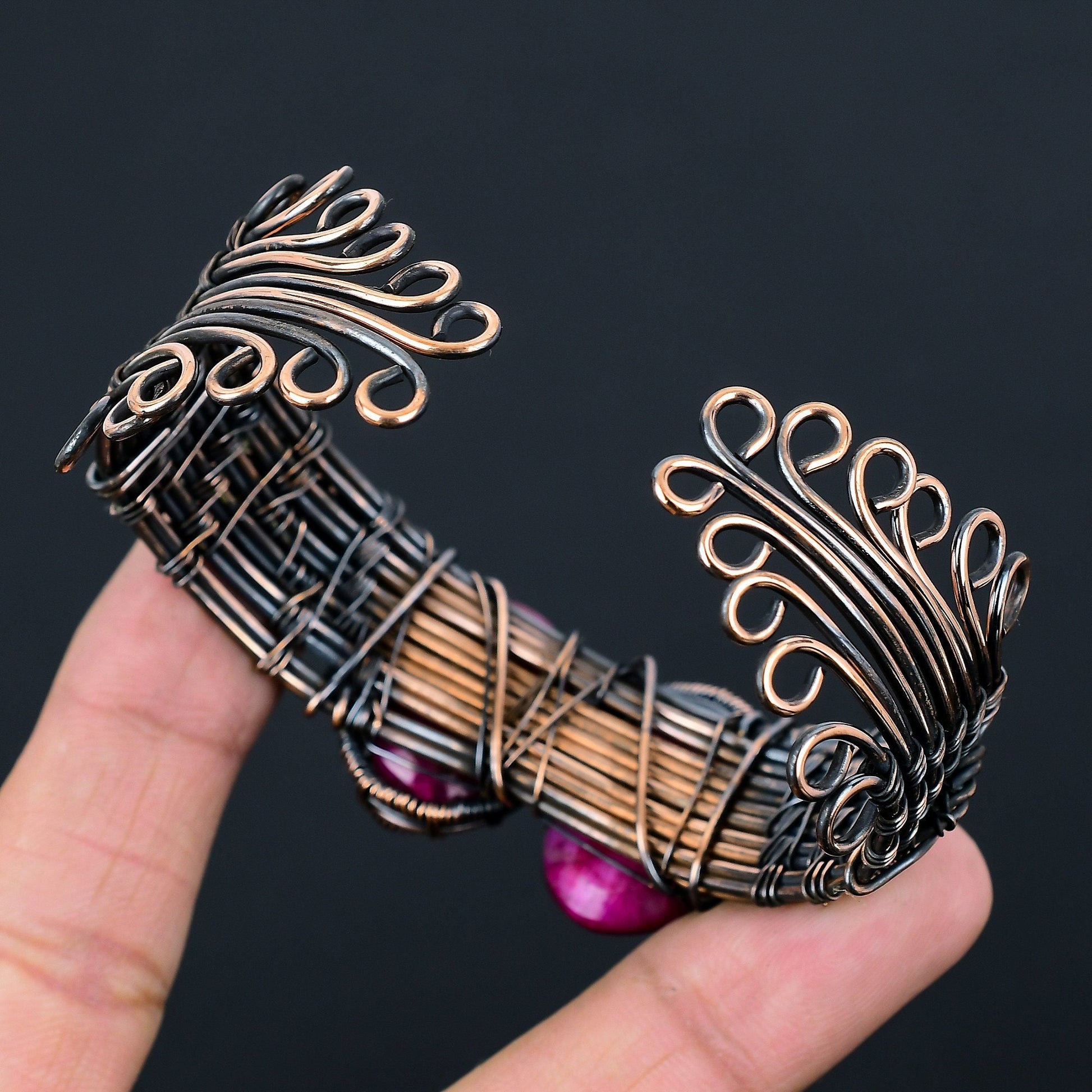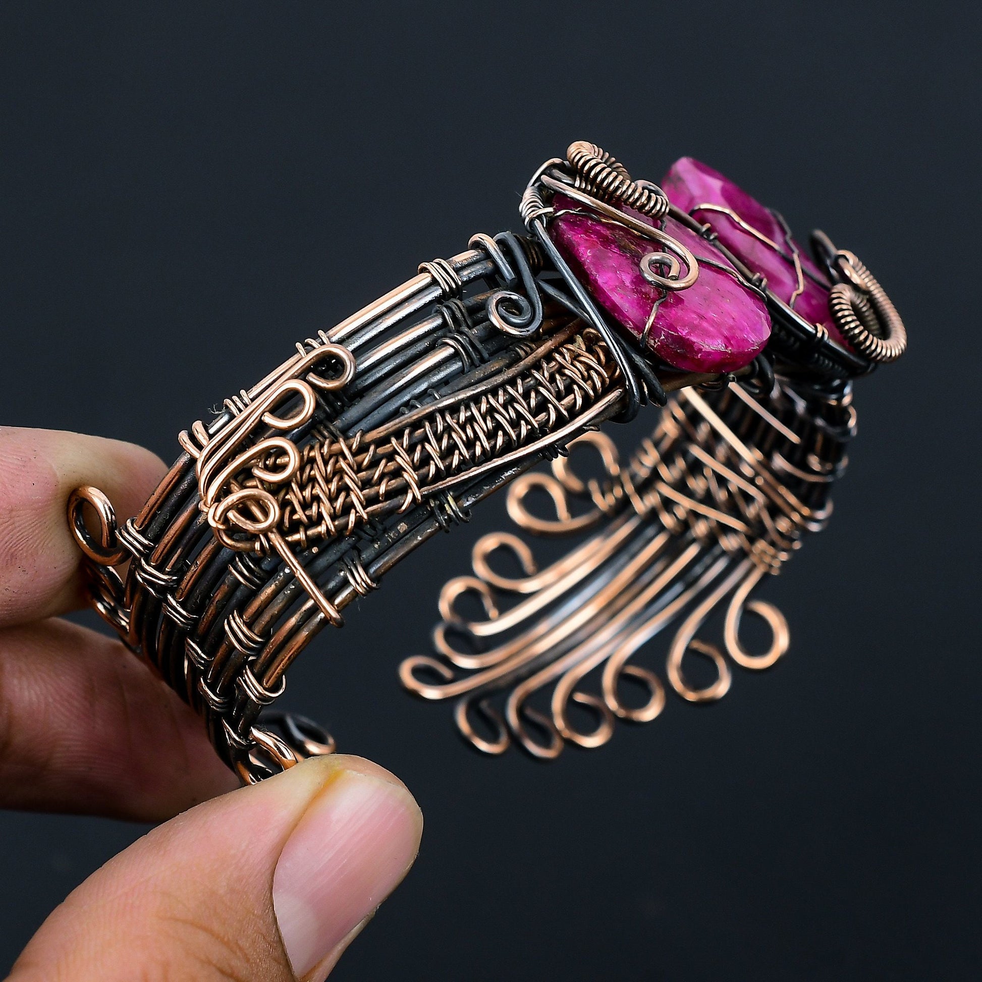 This stunning bracelet features dual deep pink gemstones, elegantly encased in intricate wirework that showcases a perfect blend of rustic charm and modern sophistication.