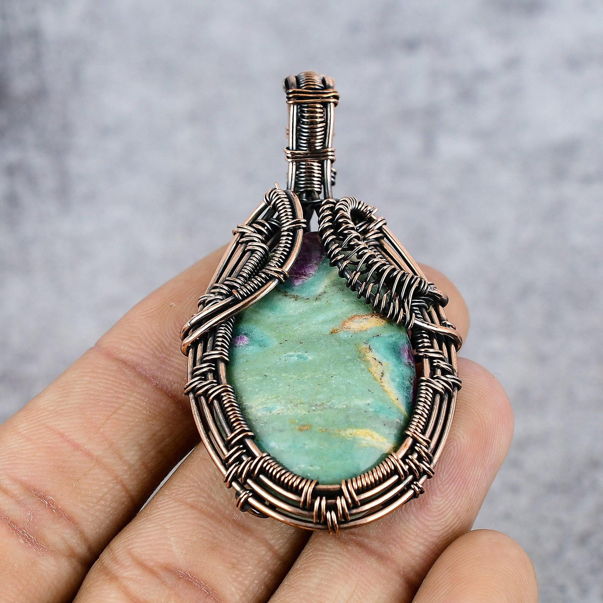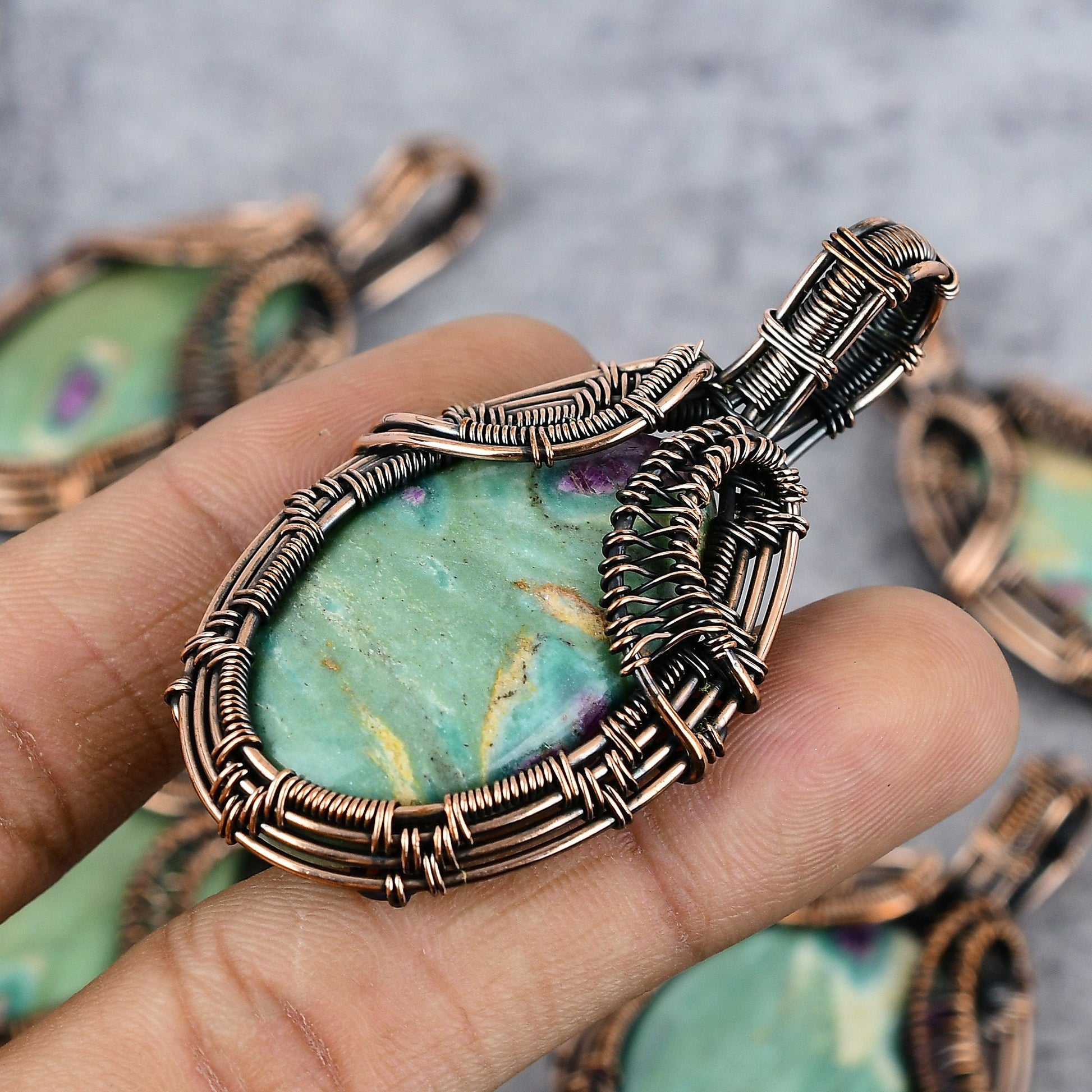 Elevate your style with this exquisite handcrafted pendant, showcasing a stunning turquoise gemstone beautifully wrapped in intricate copper wirework.