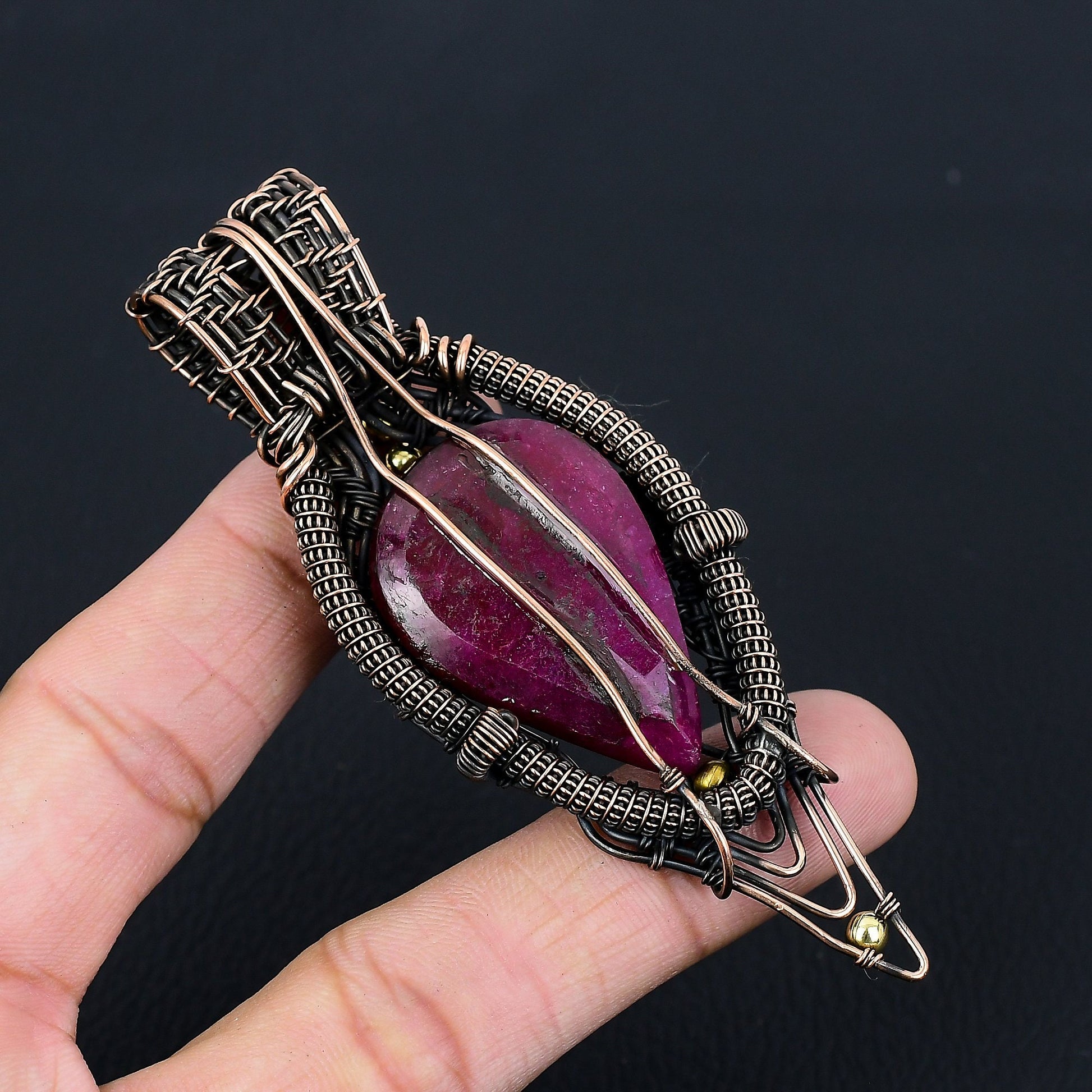 Featuring a stunning deep red gemstone, expertly wrapped with an intricate wire design that enhances its natural beauty.