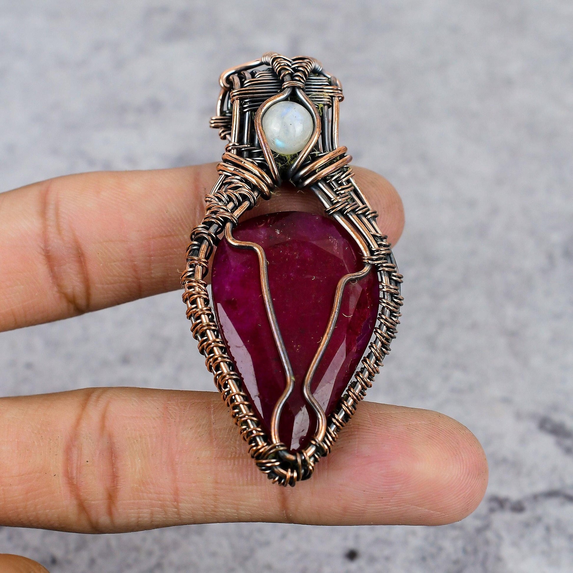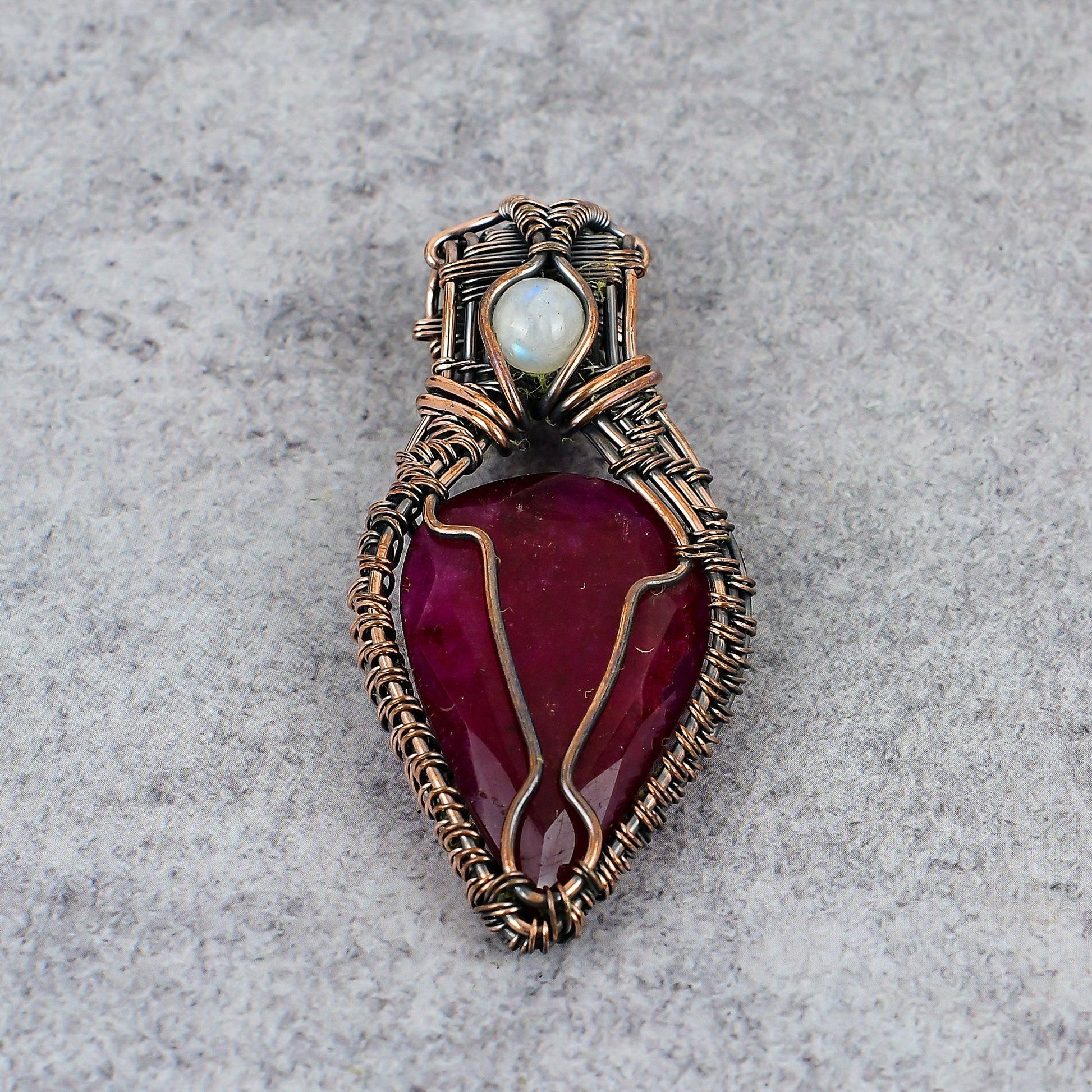 This stunning pendant features a deep ruby-red gemstone at its center, expertly wrapped in intricate copper wirework. The skillful craftsmanship highlights the rich hues and natural beauty of the stone, creating a truly unique design.