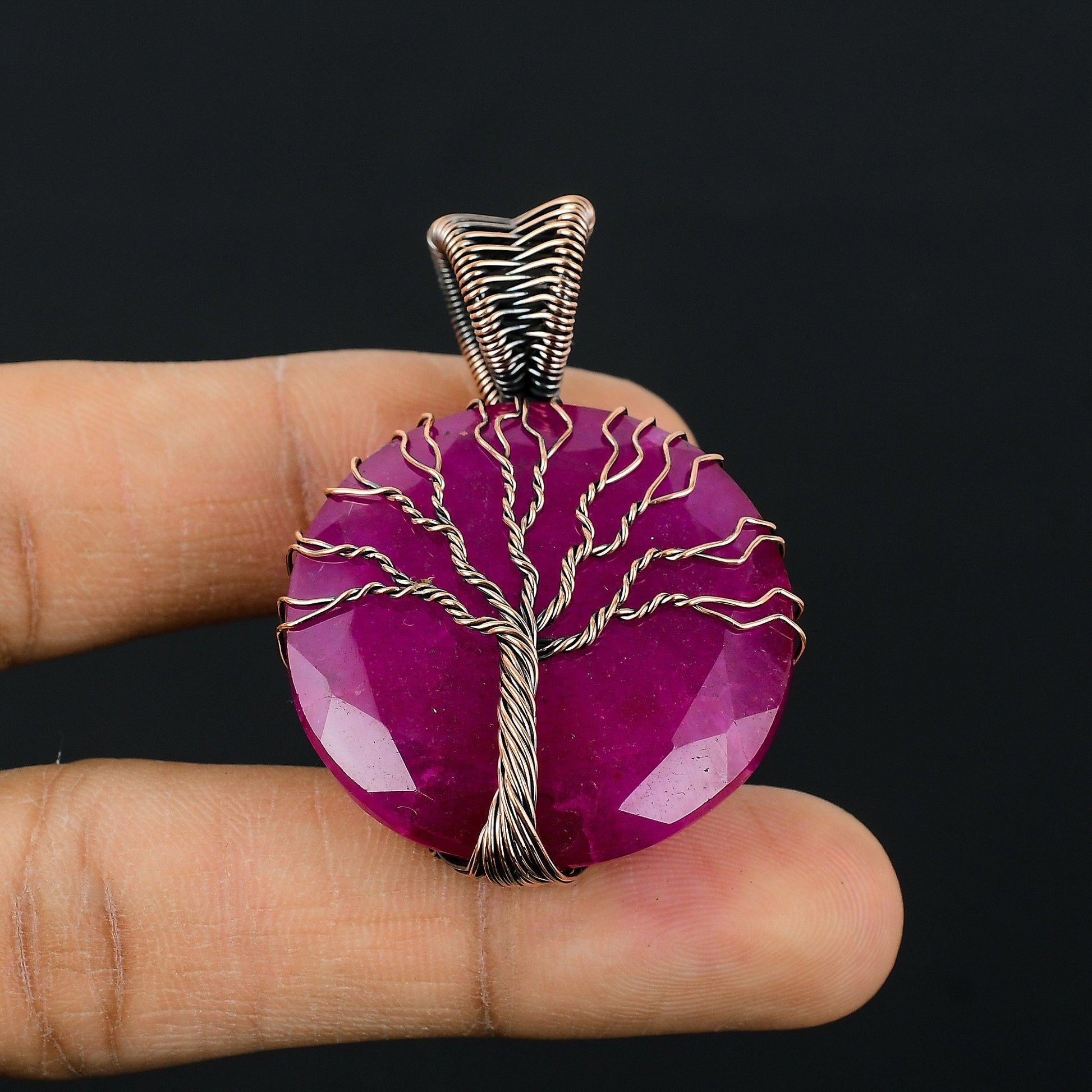 This stunning piece features a vibrant, polished gemstone carefully wrapped with intricate wire work, depicting the timeless symbol of the Tree of Life. The deep hues of the gem contrast beautifully with the metallic sheen, creating a mesmerizing effect.
