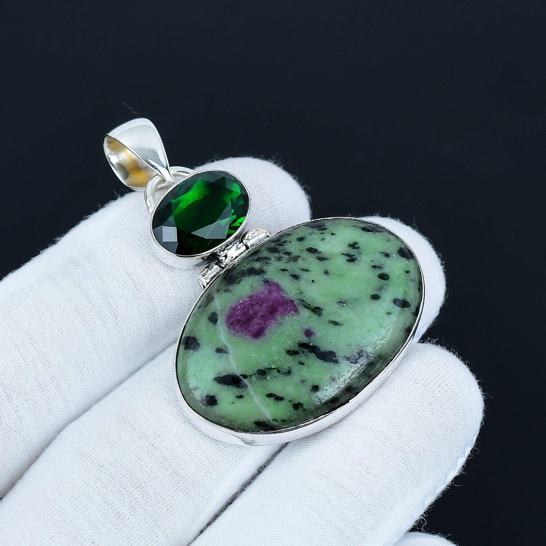 Stone Details: The pendant highlights a large oval stone with a mesmerizing green and purple pattern, alongside a faceted green gemstone, adding a touch of sophistication and luxury.
