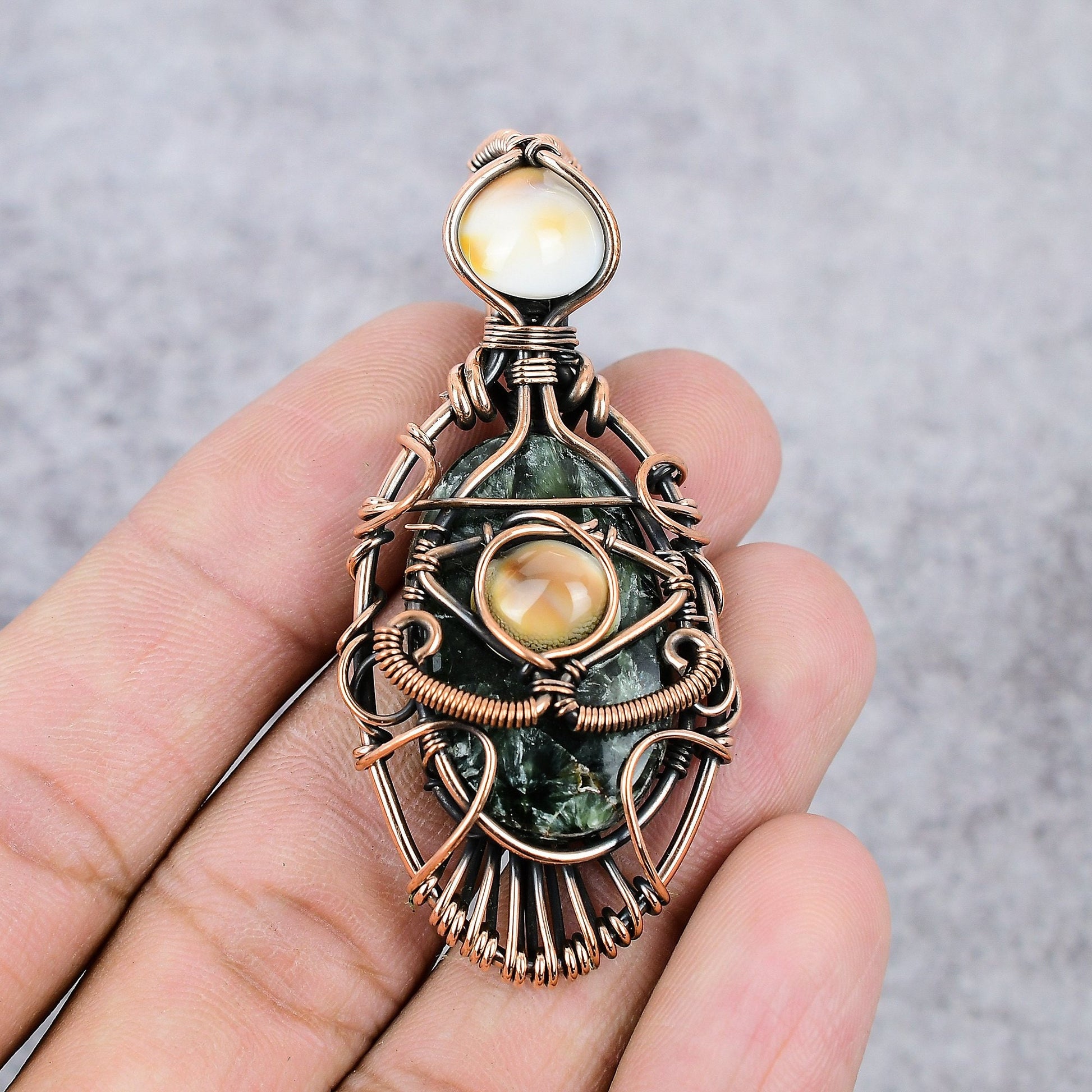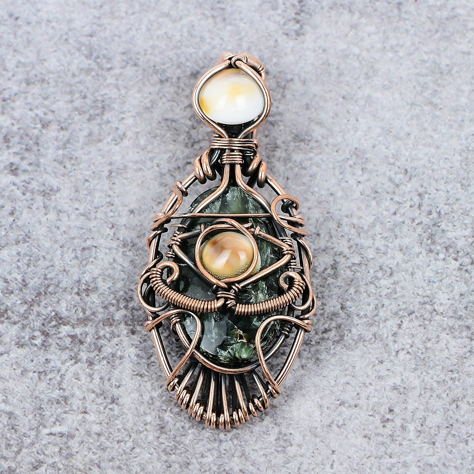 Stone & Wire: Set in intricately twisted copper wire, the pendant features two captivating stones, each with its own natural beauty.