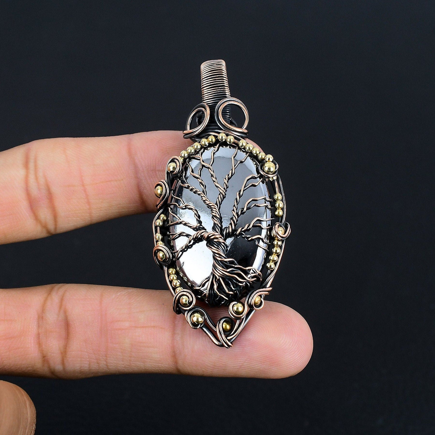 This exquisite pendant features an intricate wire-wrapped tree motif set against a polished black stone, creating a stunning contrast.