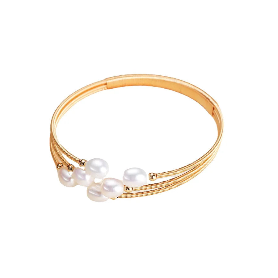 Crafted with high-quality gold plating, this bracelet is designed to add a touch of luxury to any outfit. The delicate strands are adorned with lustrous pearls, each radiating a timeless charm.
