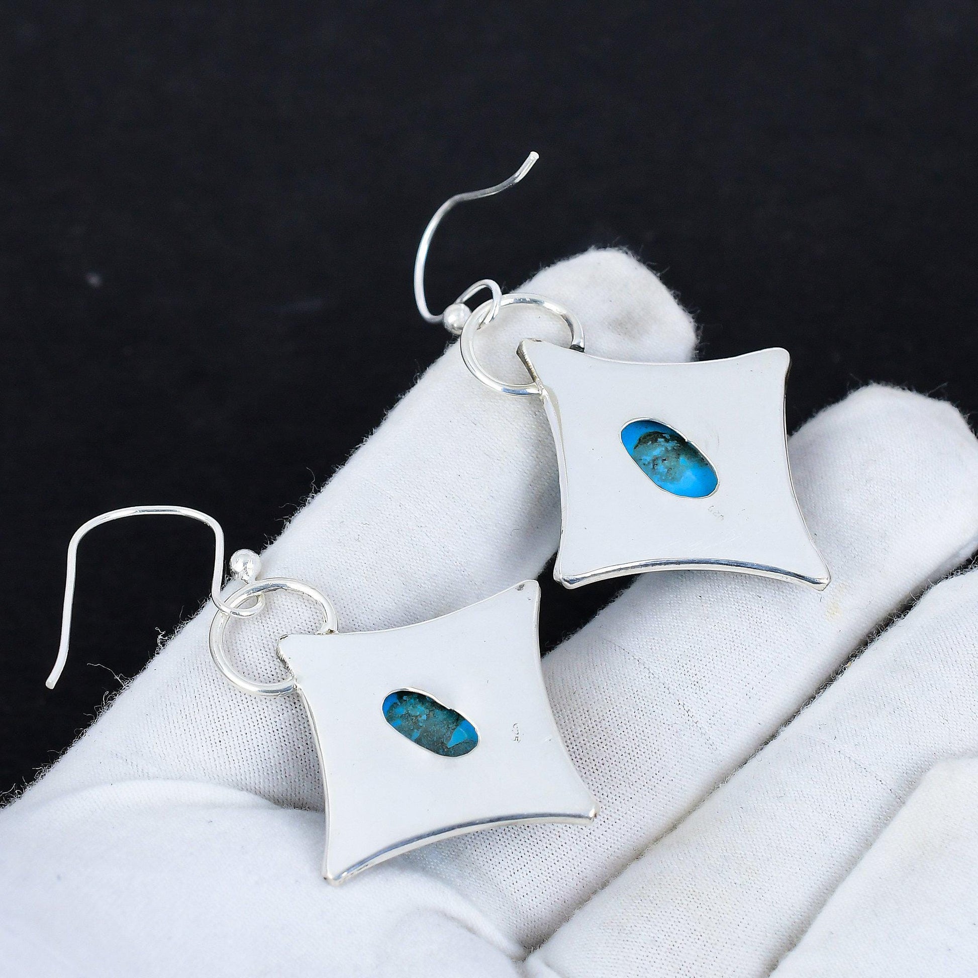 Enhance your elegance with these exquisite turquoise blue stone earrings, set in an intricately designed silver frame.