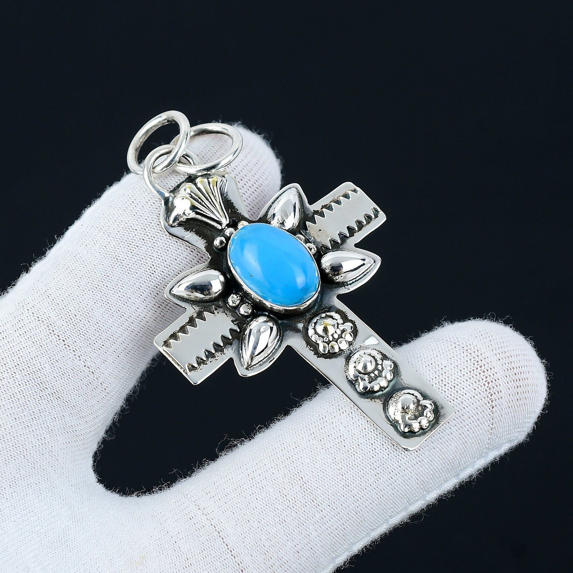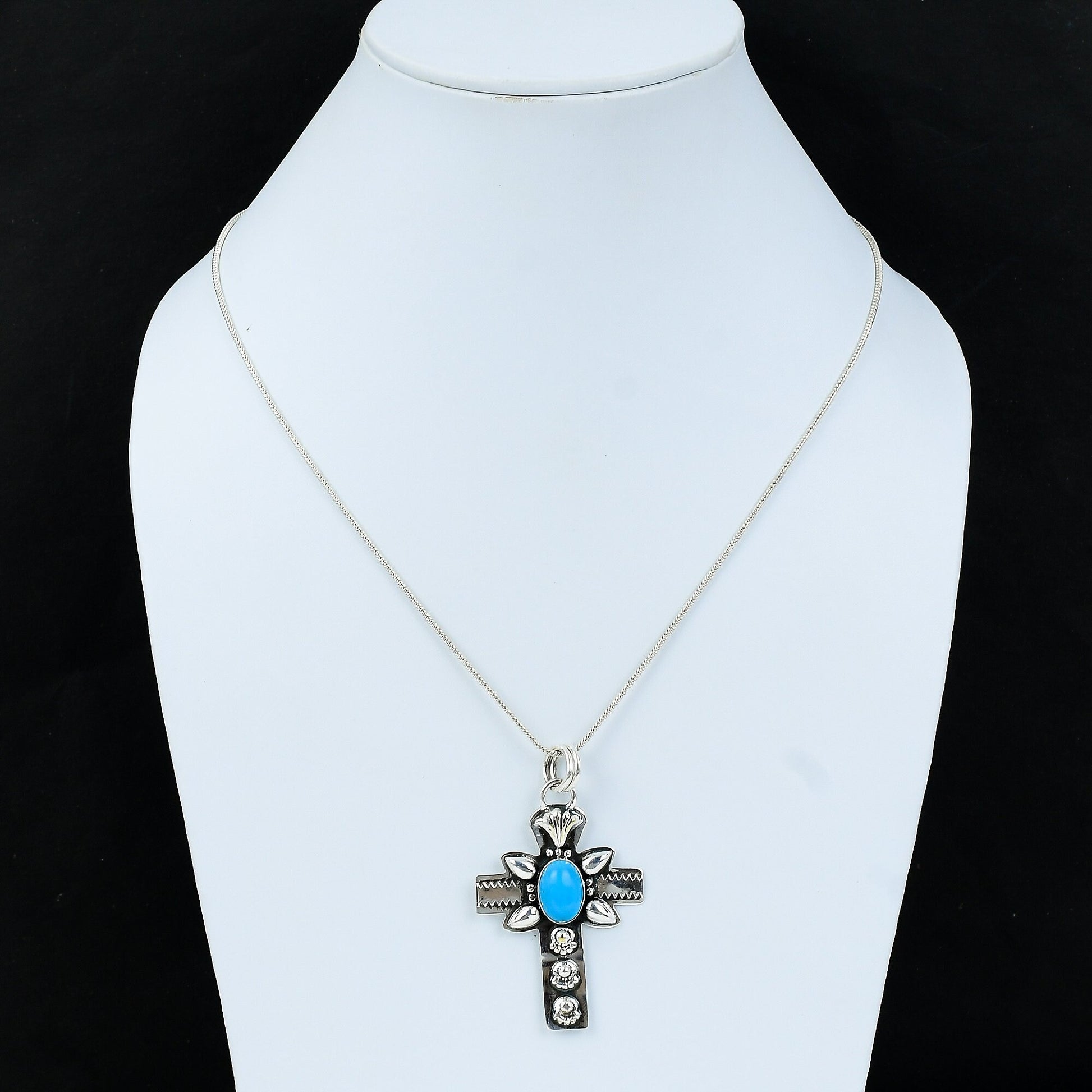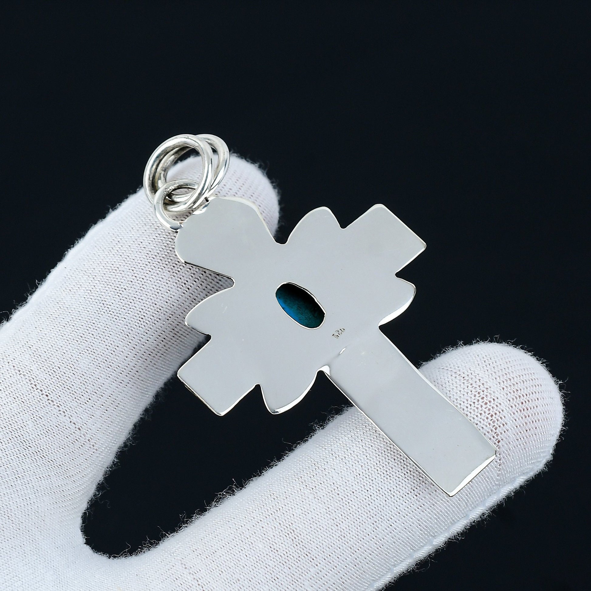 Discover the elegance and charm of our handcrafted luxury crucifix pendant. This exquisite piece features a striking central turquoise stone, beautifully set amidst intricate silver detailing that enhances its refined beauty.