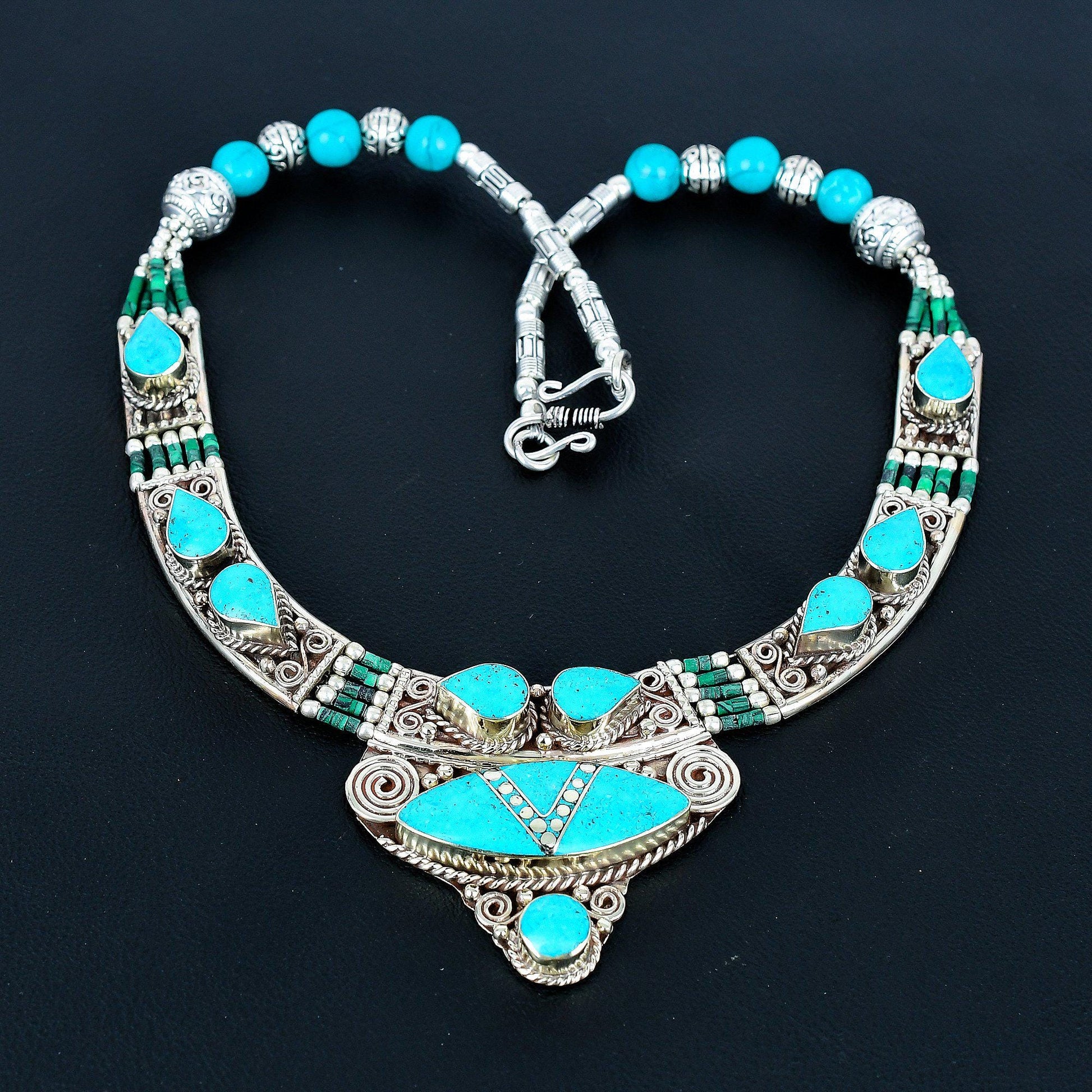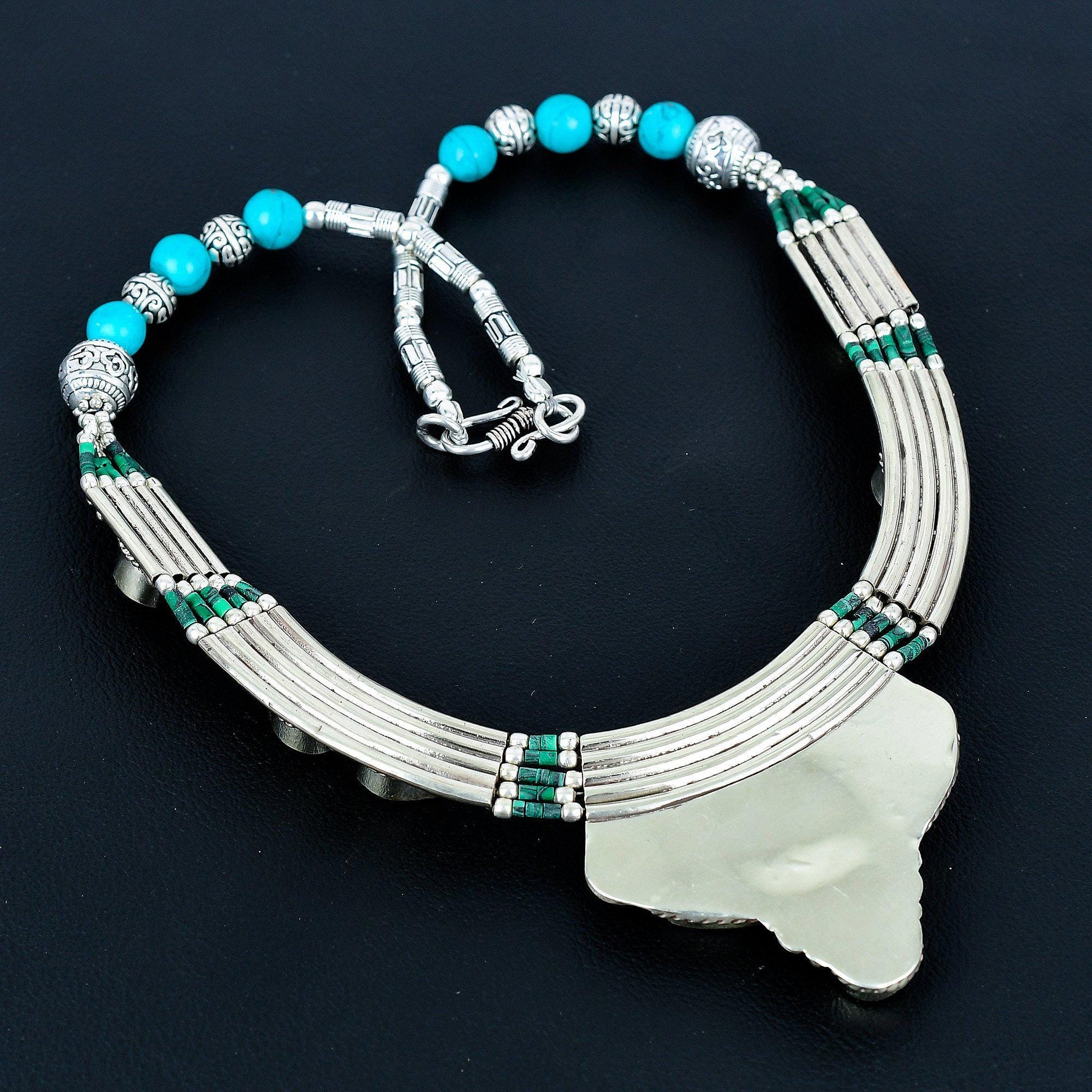 Elevate your style with this exquisite turquoise and silver necklace, a masterpiece of craftsmanship and elegance. Featuring vibrant turquoise stones intricately set in a detailed silver design, this necklace is perfect for making a statement.