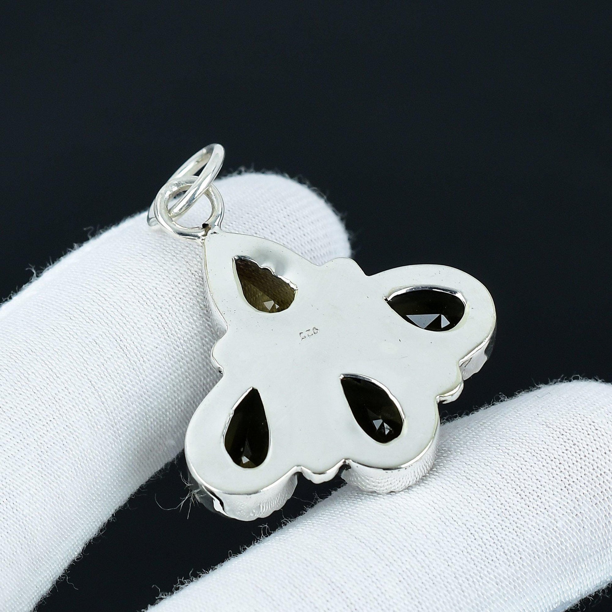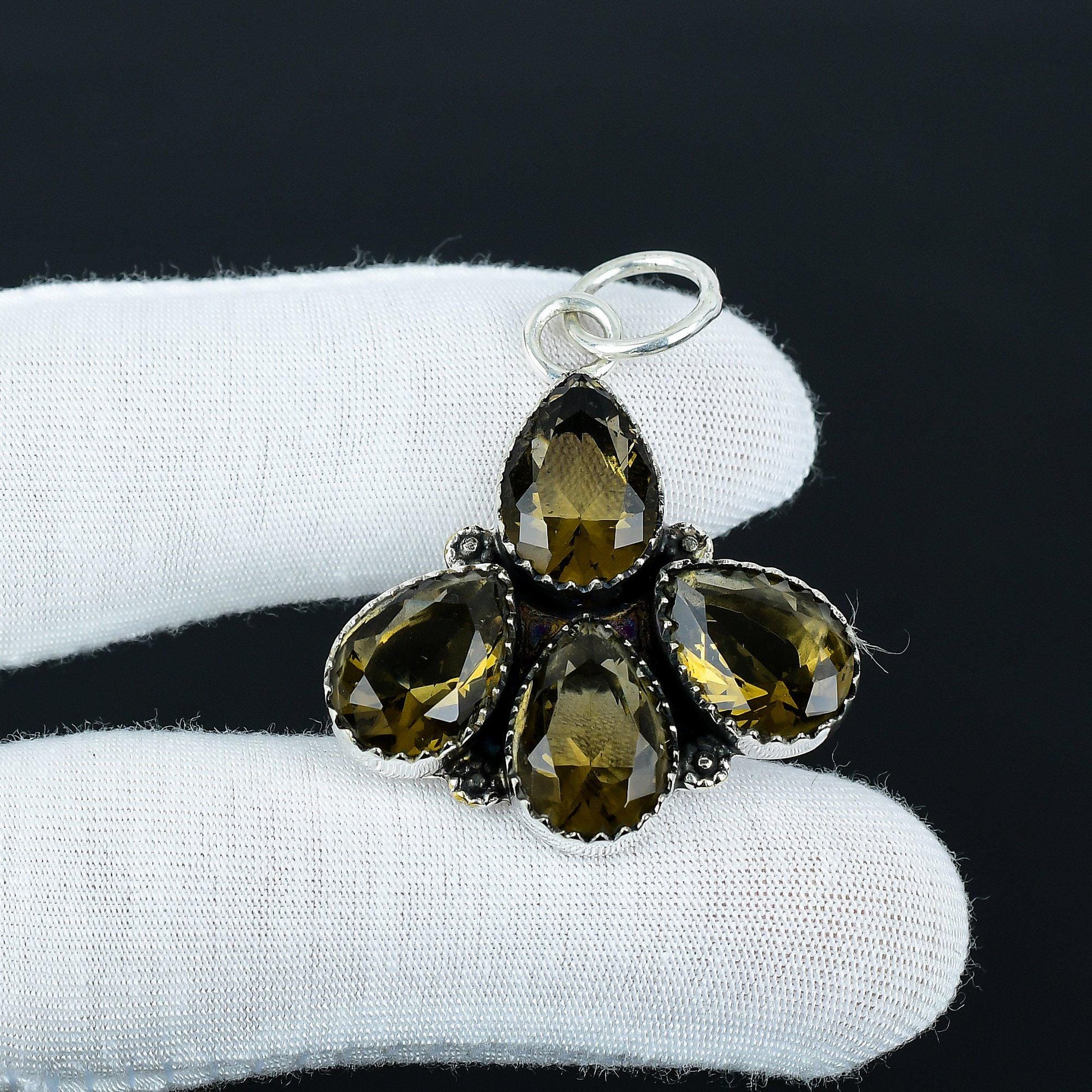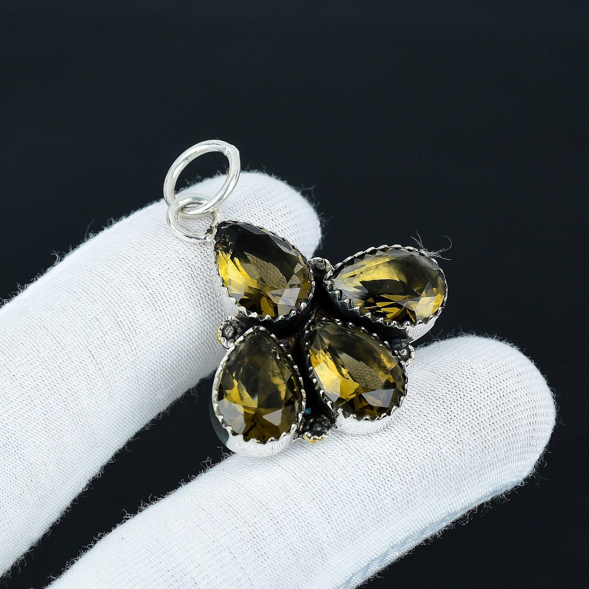 Enhance your elegance with this exquisite pendant, featuring a cluster of four stunning amber-colored teardrop gemstones, each intricately faceted to reflect maximum light and brilliance.