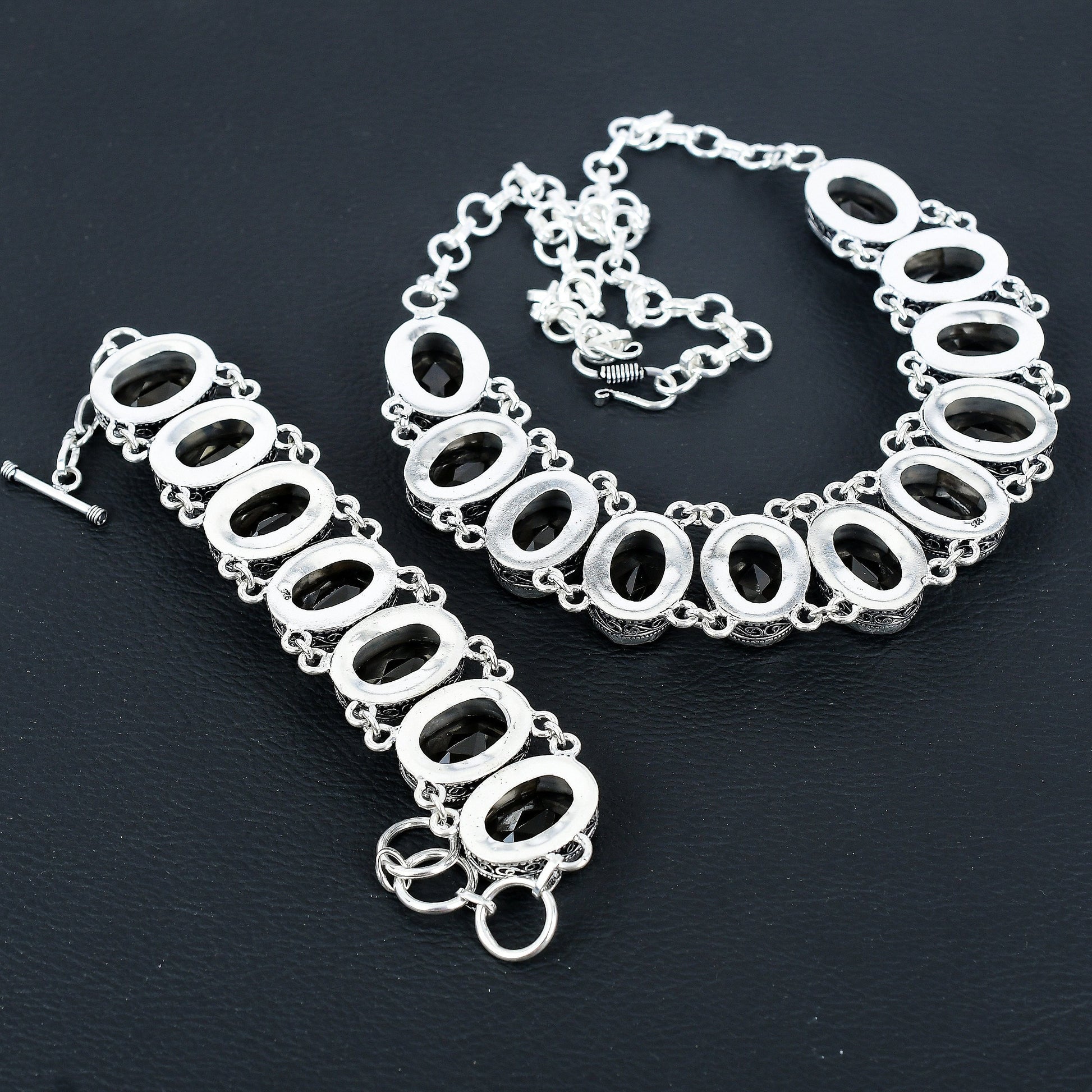 Introducing our exquisite Vintage Statement Necklace, a true embodiment of elegance and sophistication. This stunning piece features a series of beautifully cut, oval smoky quartz stones, each encased in intricately detailed silver settings that capture the essence of vintage charm.
