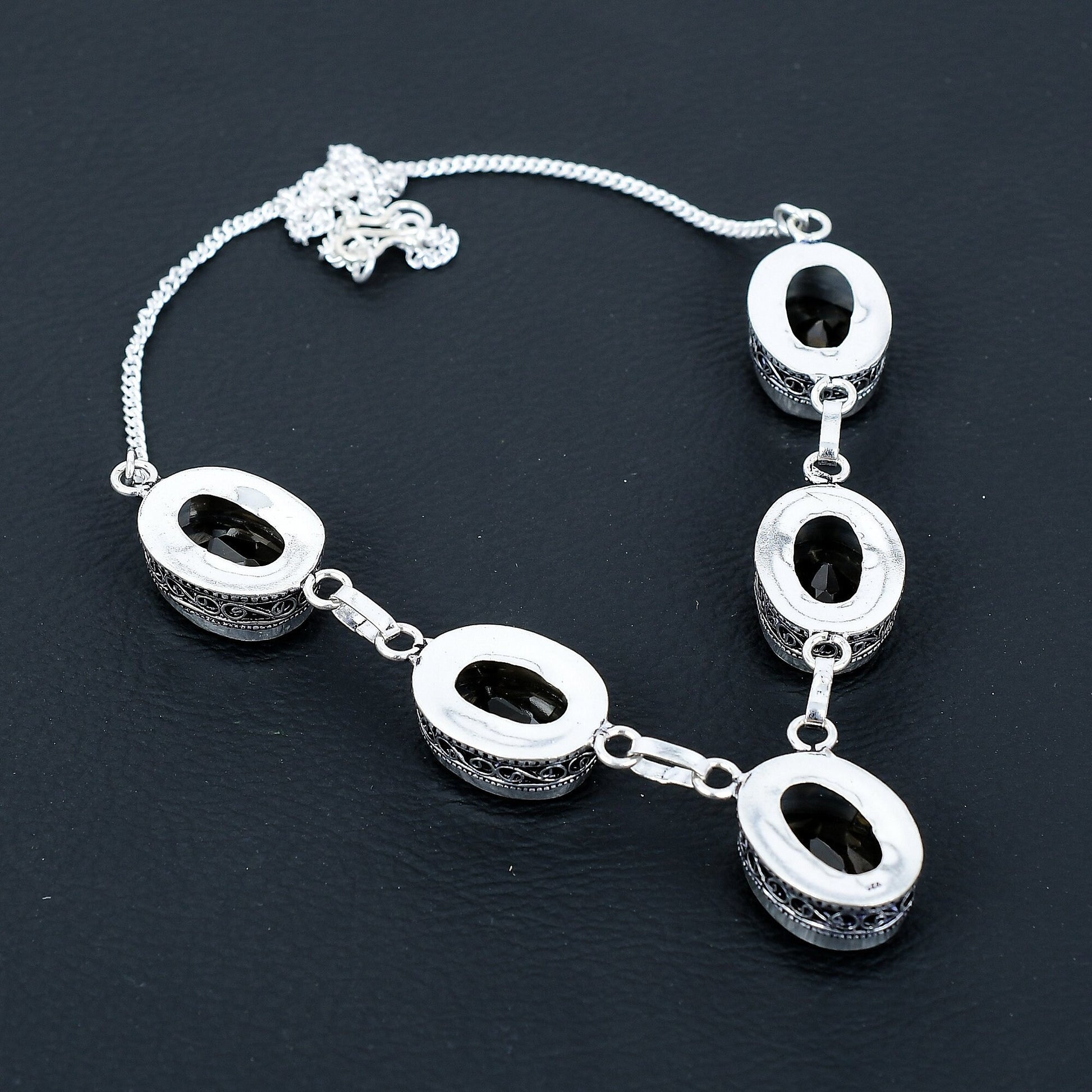 This stunning piece features five oval-cut smoky quartz stones, each beautifully encased in an intricately designed silver setting that showcases the gemstones' rich, warm hues.