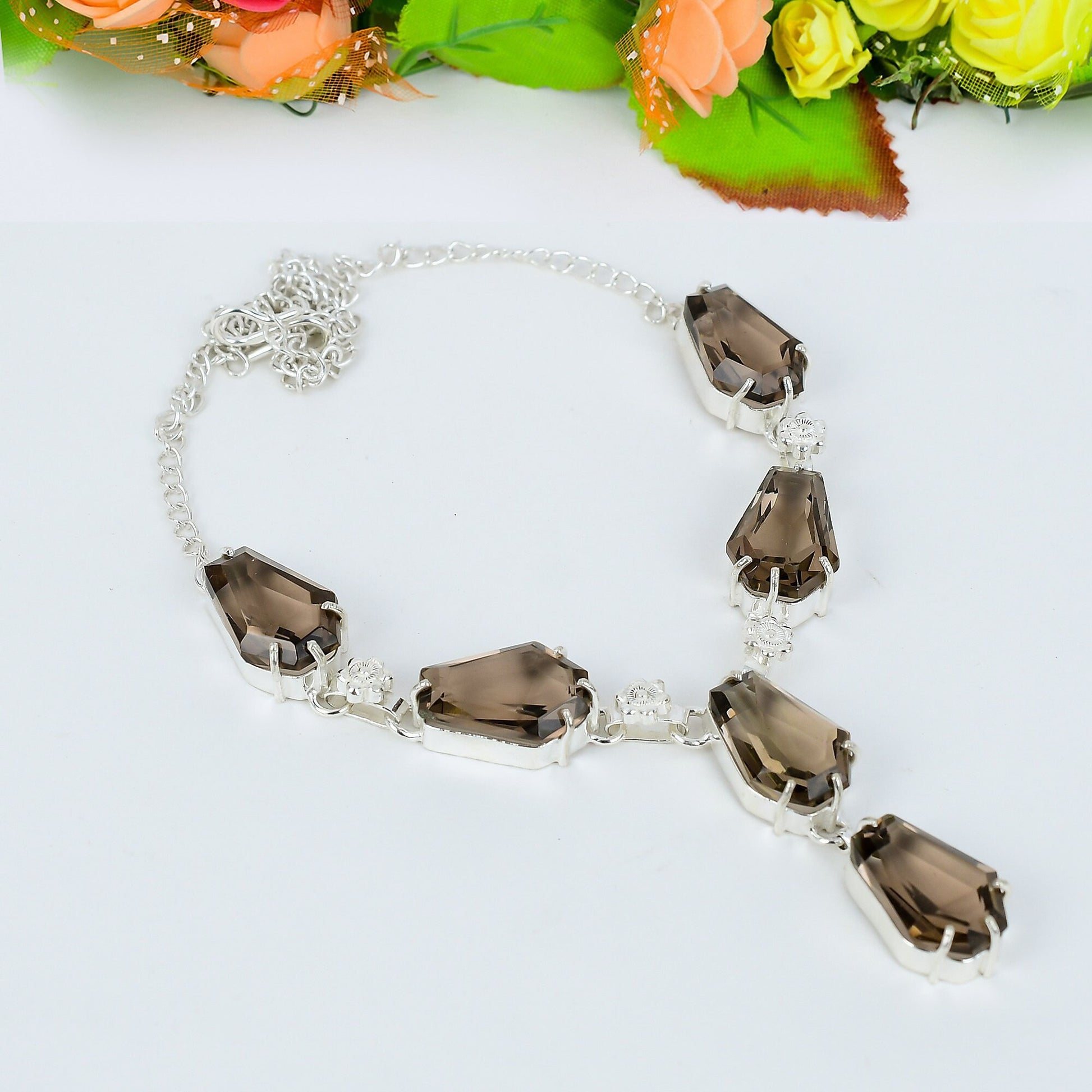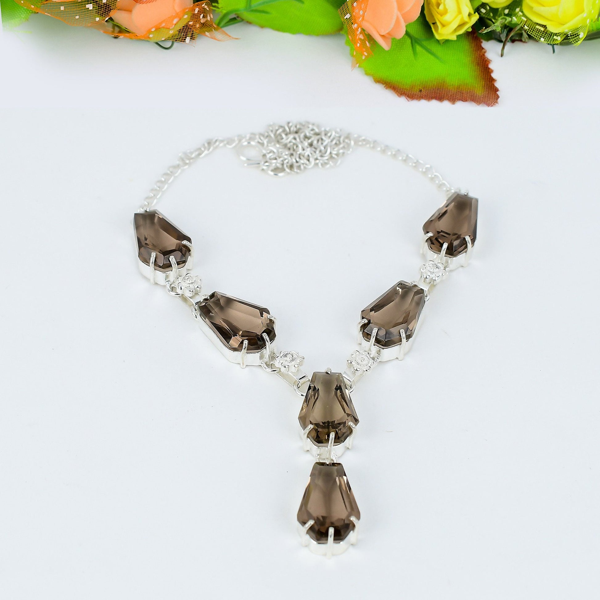 Featuring five stunning smoky quartz gemstones, each expertly cut to showcase their unique facets, this necklace blends classic charm with modern flair.