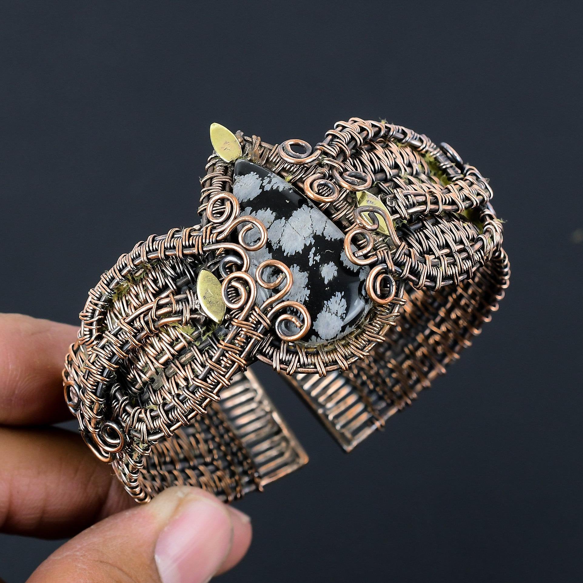 This intricate bracelet is crafted with high-quality copper wire, expertly woven to create a mesmerizing design that wraps comfortably around your wrist. Its distinctive style is highlighted by a polished central gemstone, adding a unique focal point that draws the eye and complements any outfit.