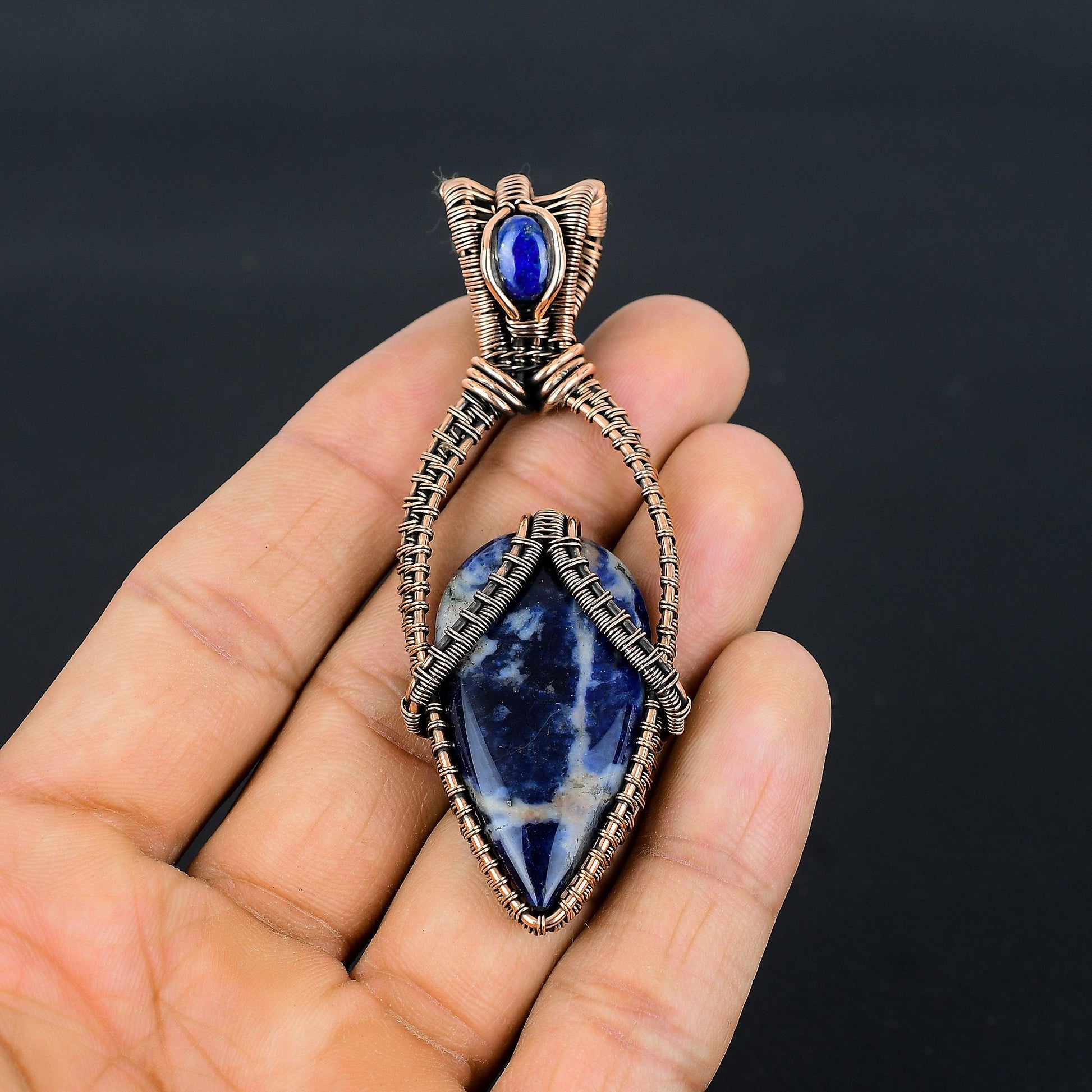 Design: This unique piece showcases intricate wire wrapping in artisan-style craftsmanship, creating a one-of-a-kind statement. The copper wiring beautifully complements the deep blues and whites of the sodalite.