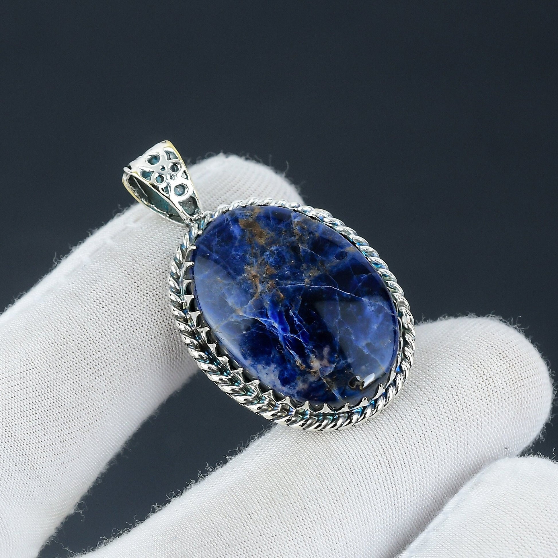 Elevate your style with our stunning lapis lazuli pendant, artfully set in a decorative silver frame that perfectly complements the deep blue hues of the stone.