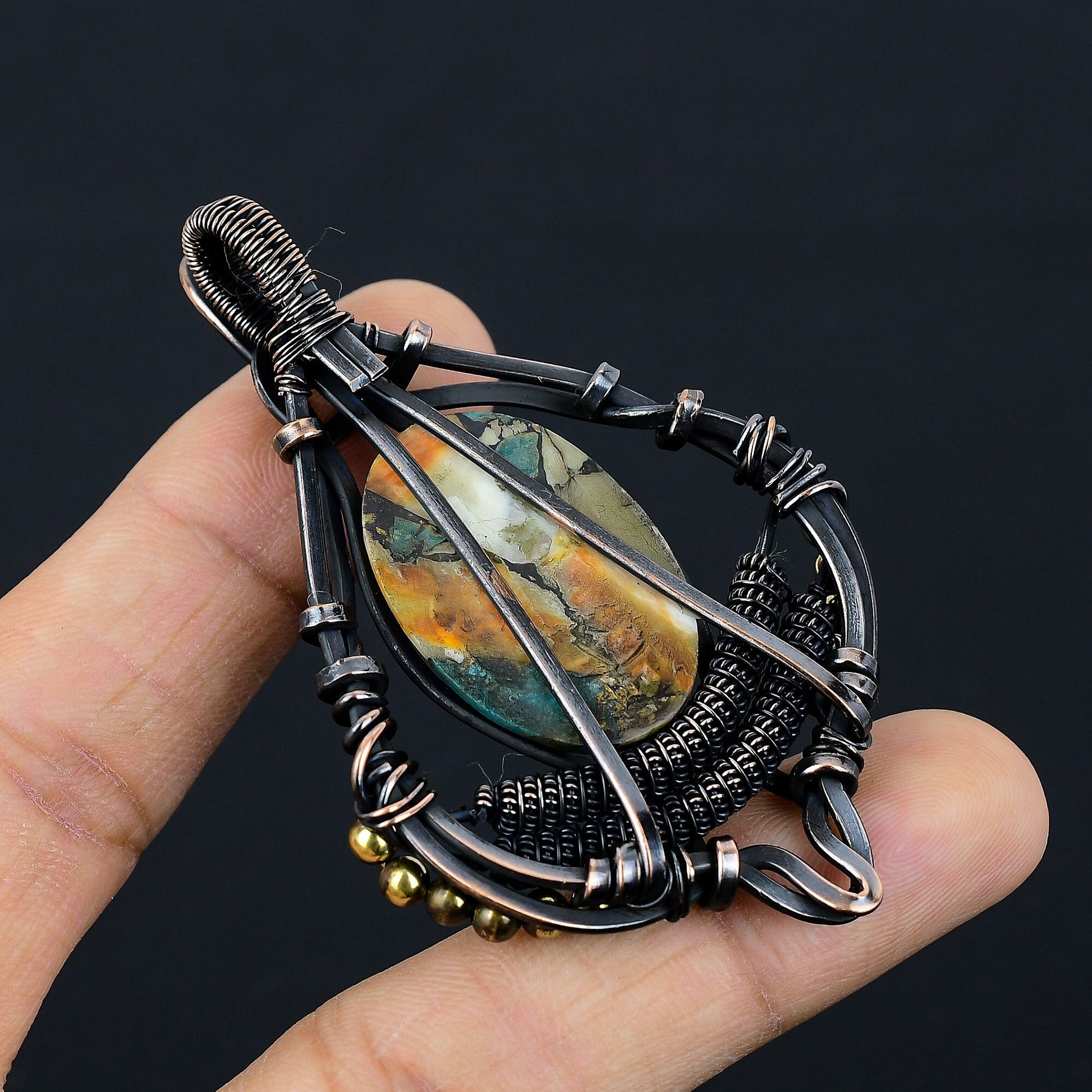 Discover the allure of our handcrafted pendant, a masterpiece of artistic design and natural beauty. This exquisite piece features a stunning centerpiece stone in vibrant shades of blue, orange, and cream, capturing the essence of Earth's rich palette.