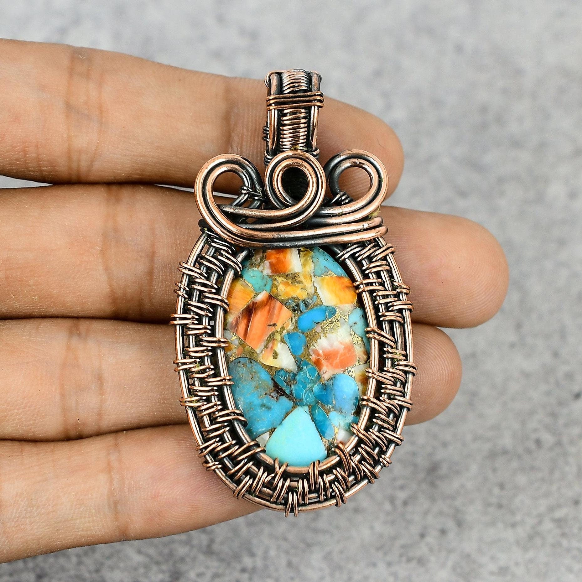 - Unique Design: Expertly woven copper wire encases a stunning mosaic of turquoise and orange stones, creating a vibrant and eye-catching centerpiece.