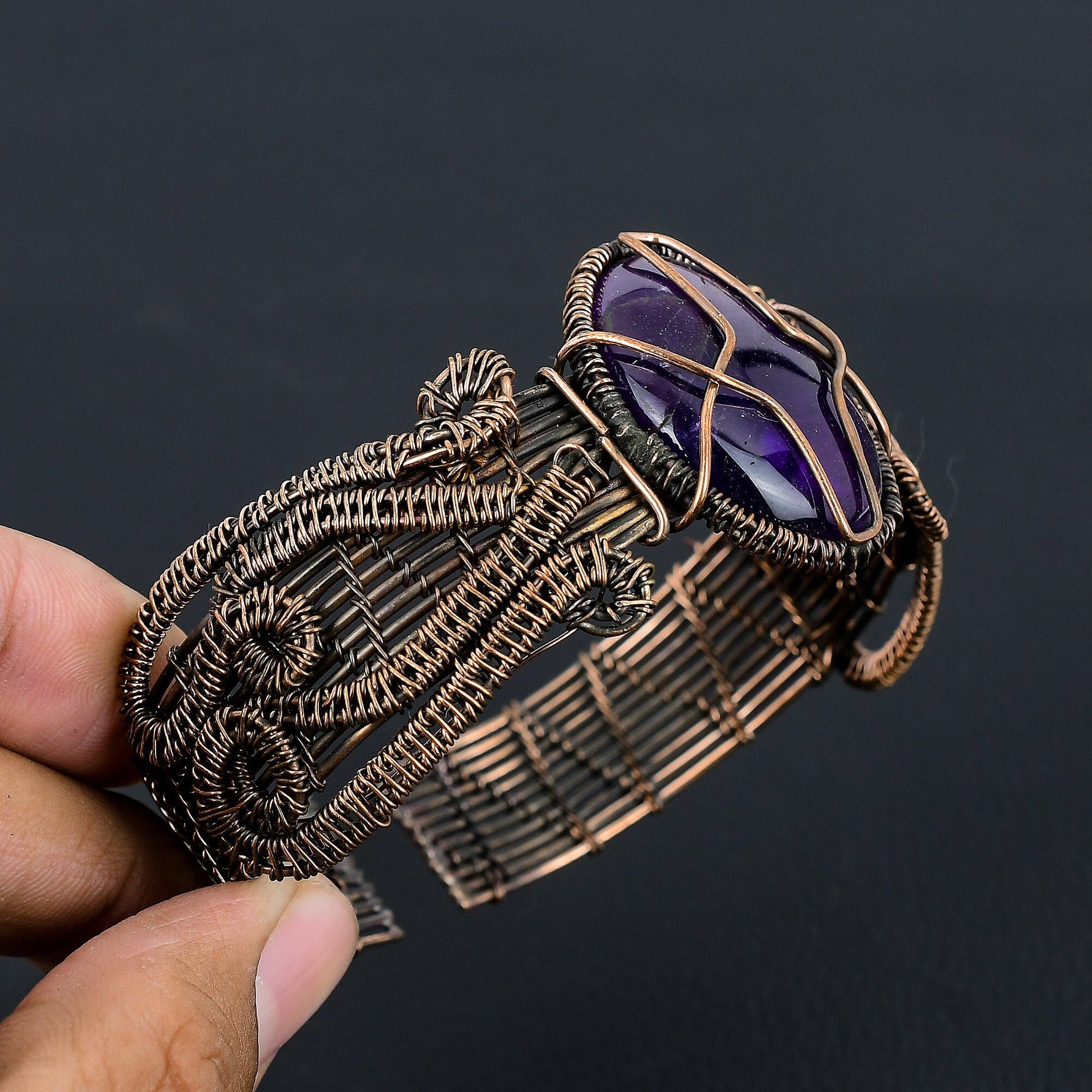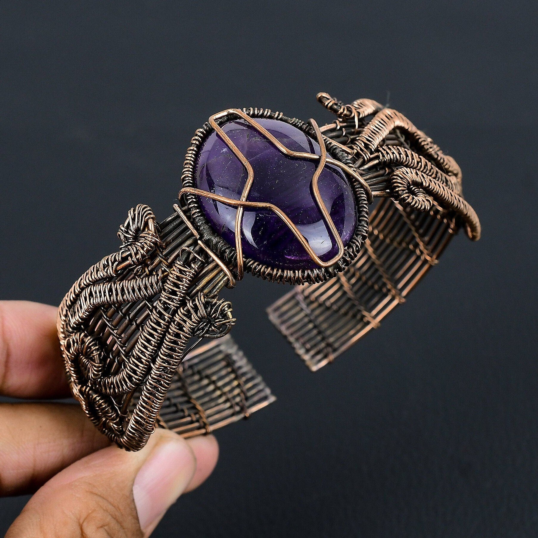 This exquisite piece features a stunning deep purple amethyst, meticulously wrapped in intricate wire detailing, creating a captivating fusion of art and nature.