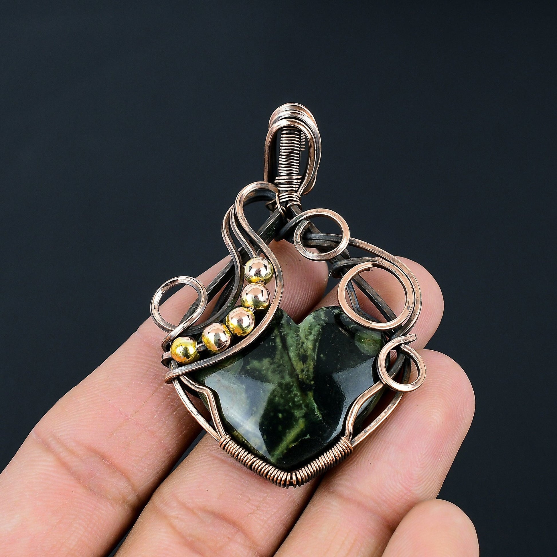 Discover the enchanting allure of our handcrafted wire-wrapped pendant, featuring a stunning heart-shaped stone nestled in an intricate copper wire design. This exquisite piece is elegantly adorned with polished metallic accents, adding a touch of sophistication and glamour.