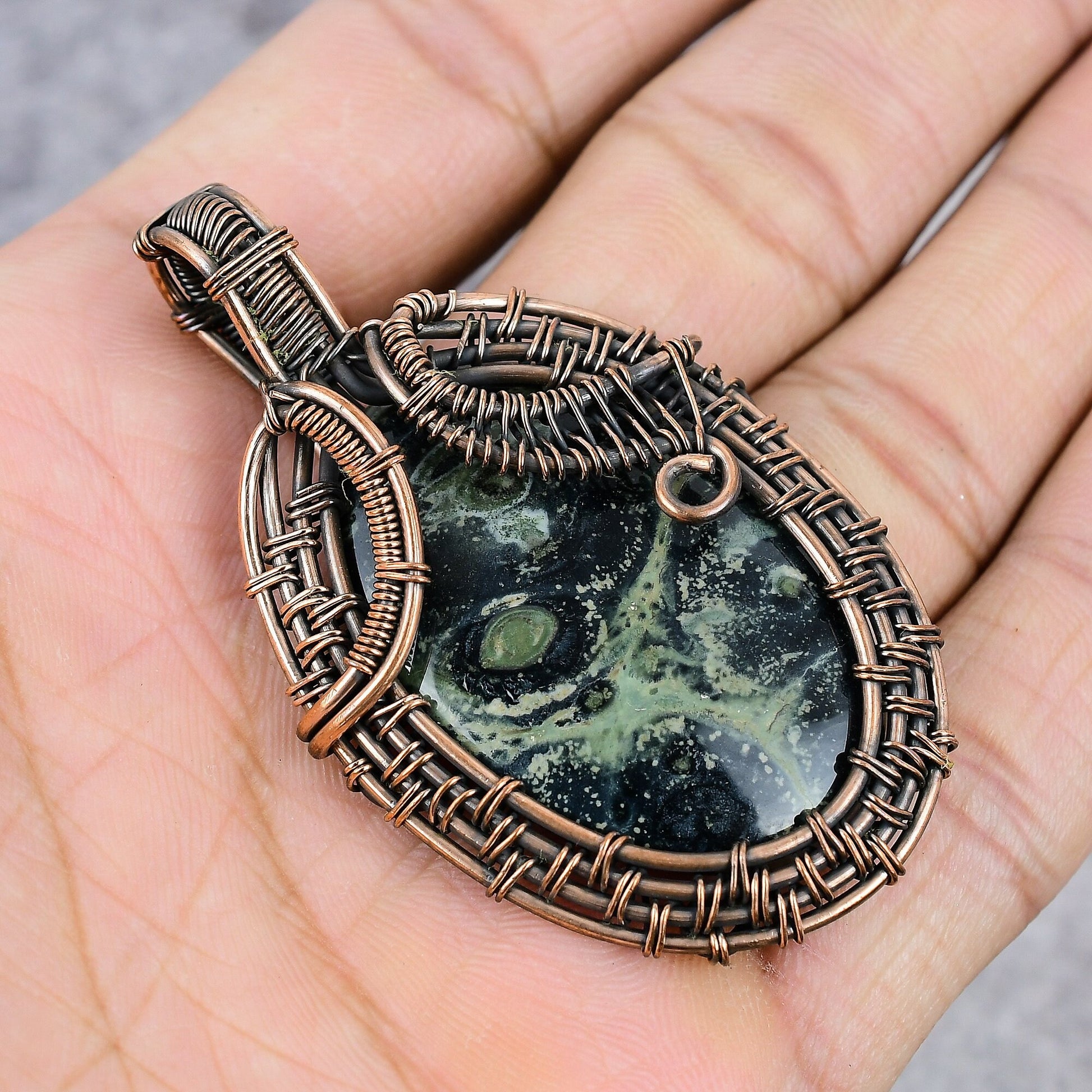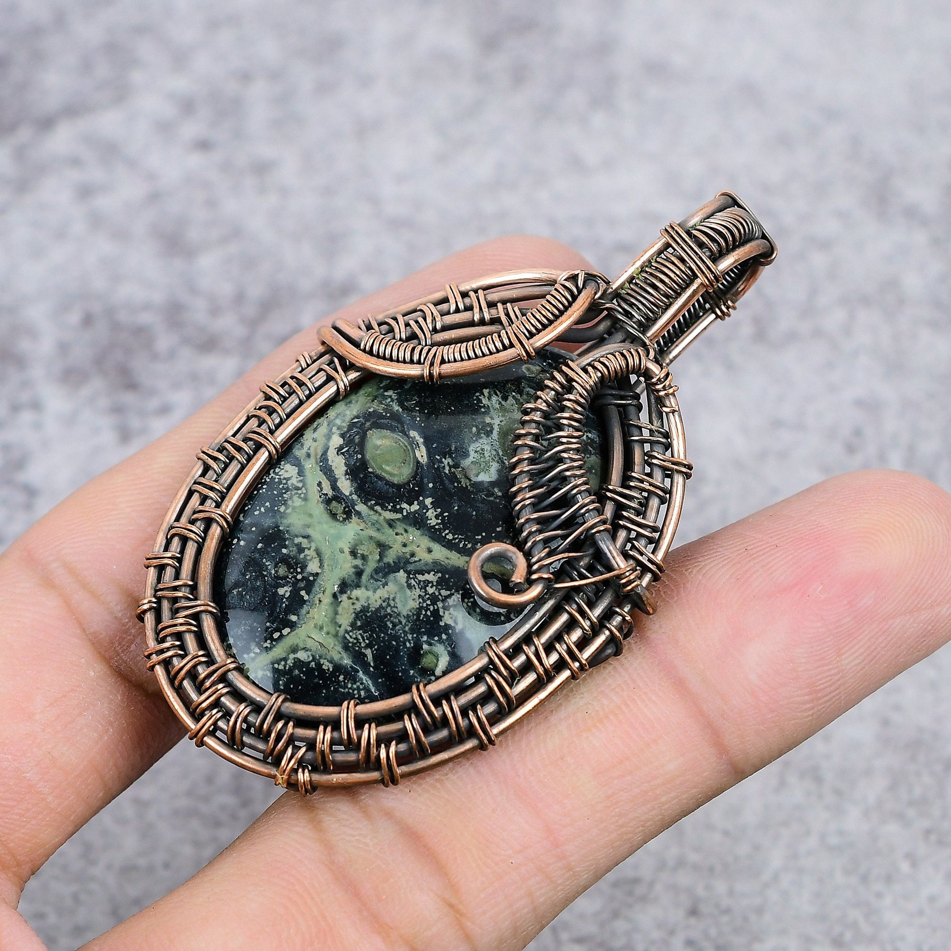 Discover the exquisite elegance of our handcrafted copper wire-wrapped pendant, featuring a captivating green and black stone at its heart.