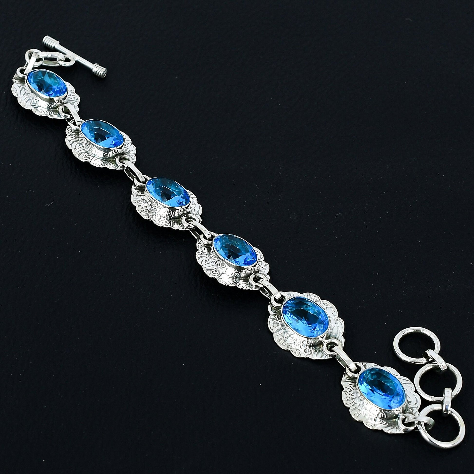 This stunning bracelet features vibrant blue gemstones intricately set in a beautifully detailed silver setting, offering a touch of sophistication to any outfit.