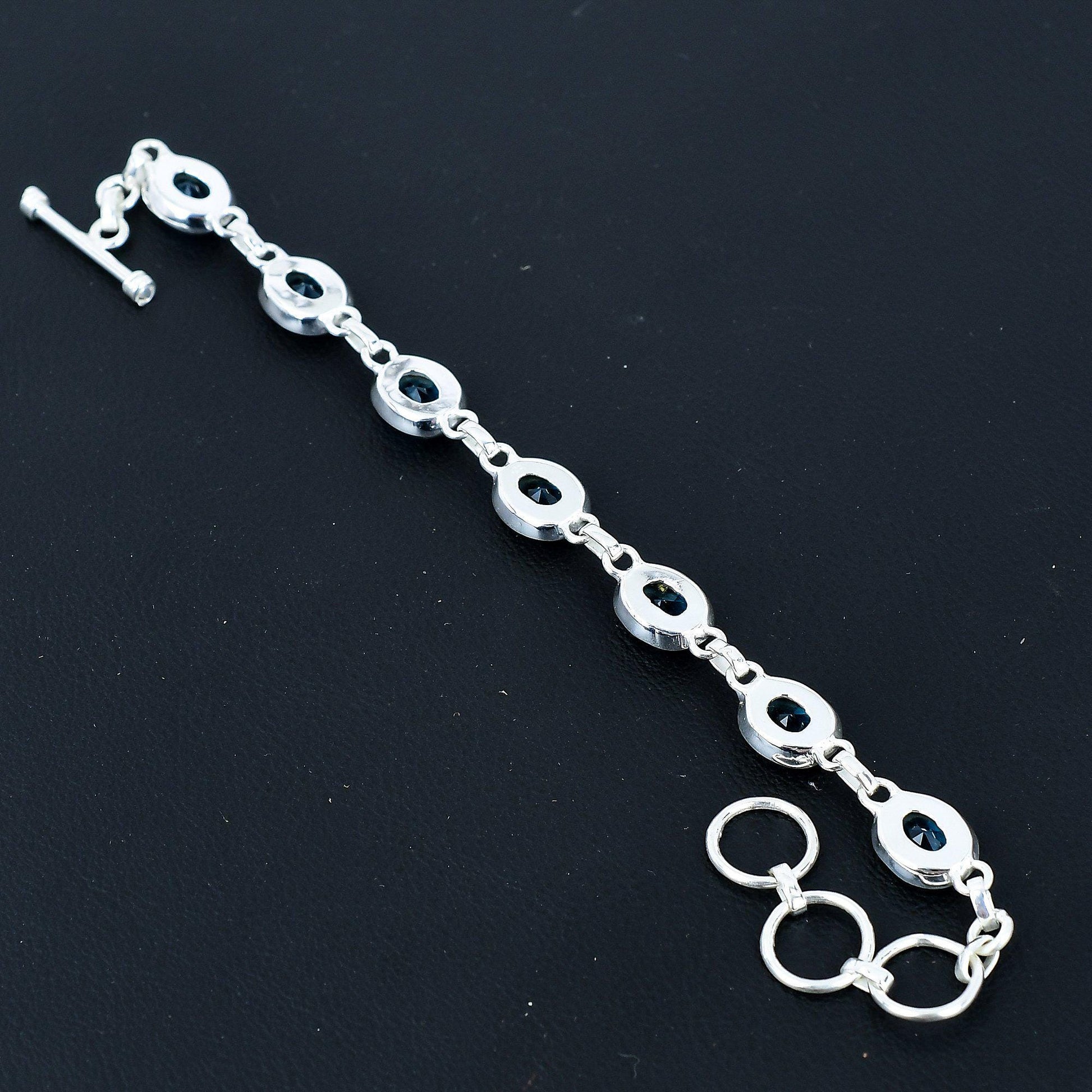 Design: Crafted with precision, this bracelet features dazzling blue gemstones, each artfully set in a sterling silver frame, reflecting timeless beauty and sophistication.