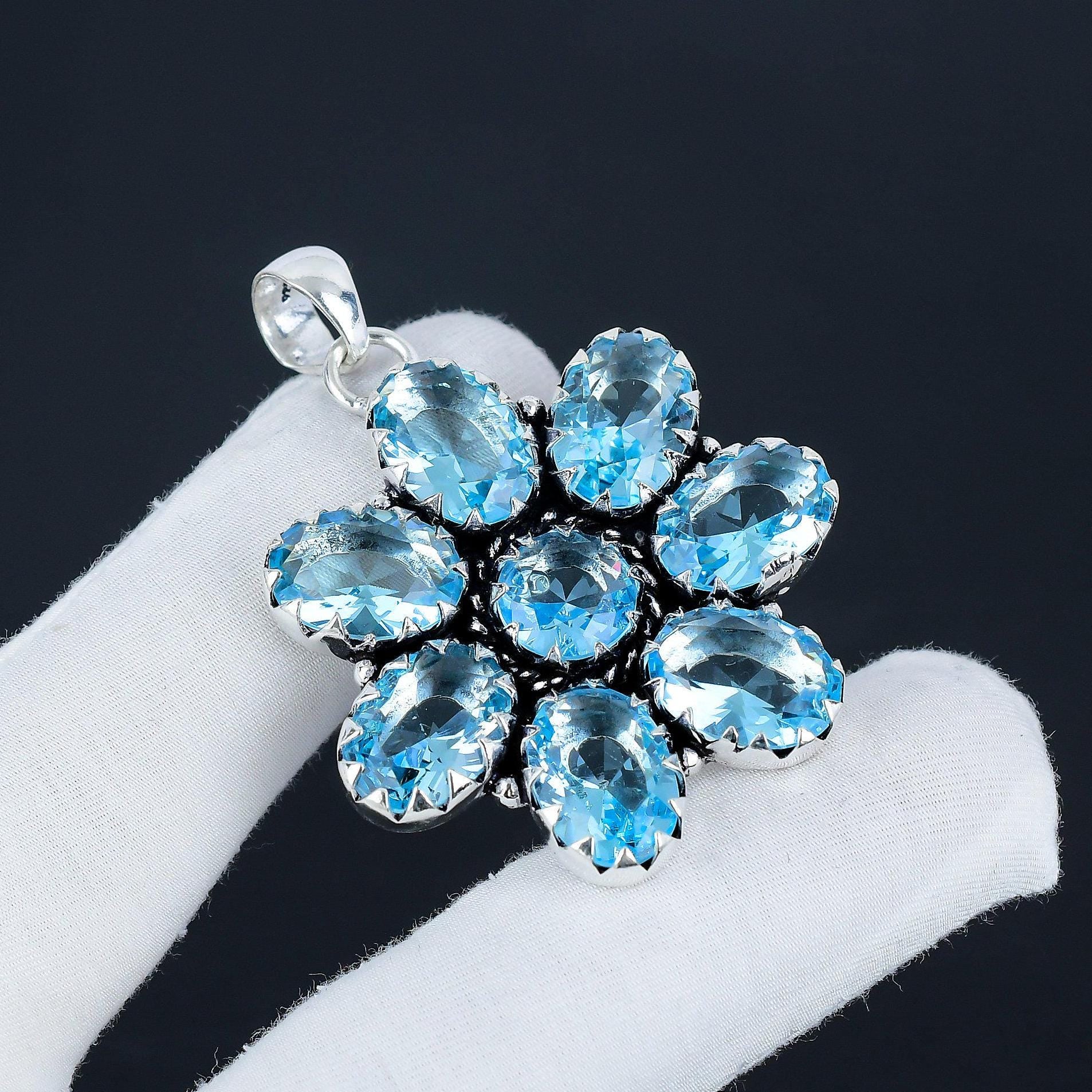 Introducing our exquisite Blue Topaz Flower Pendant, a true masterpiece of elegance and craftsmanship. This stunning piece features eight beautifully cut, sparkling blue topaz stones meticulously arranged to form a captivating floral design.
