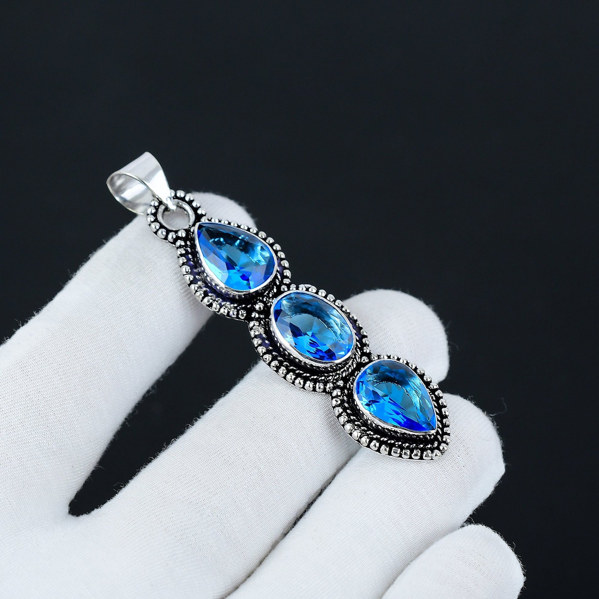Enhance your elegance with this exquisite pendant, featuring a trio of mesmerizing blue gemstones that captivate with their brilliant sparkle.