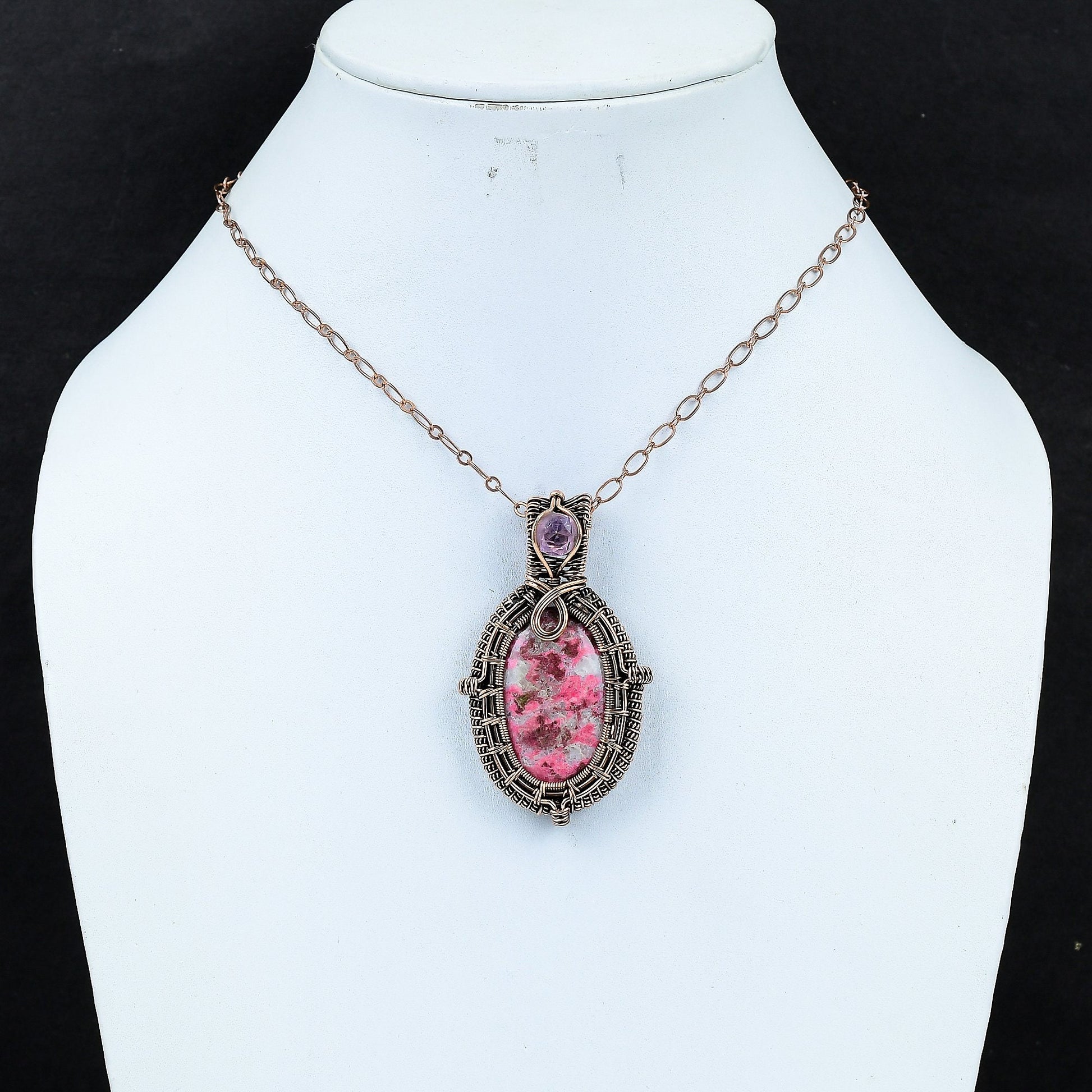 The centerpiece features a stunning oval-shaped pink and white gemstone, expertly set within a beautifully intricate, handcrafted wire frame.
