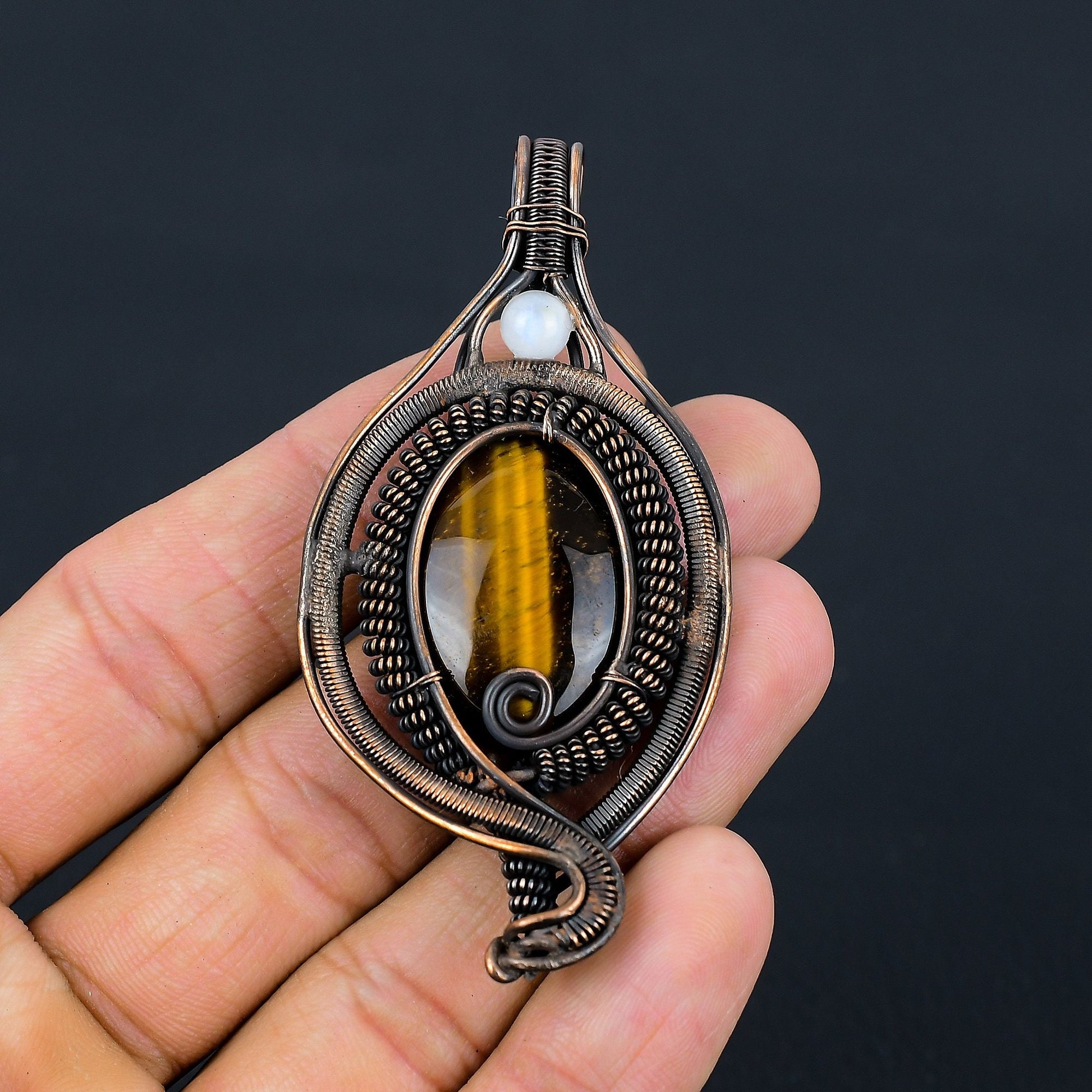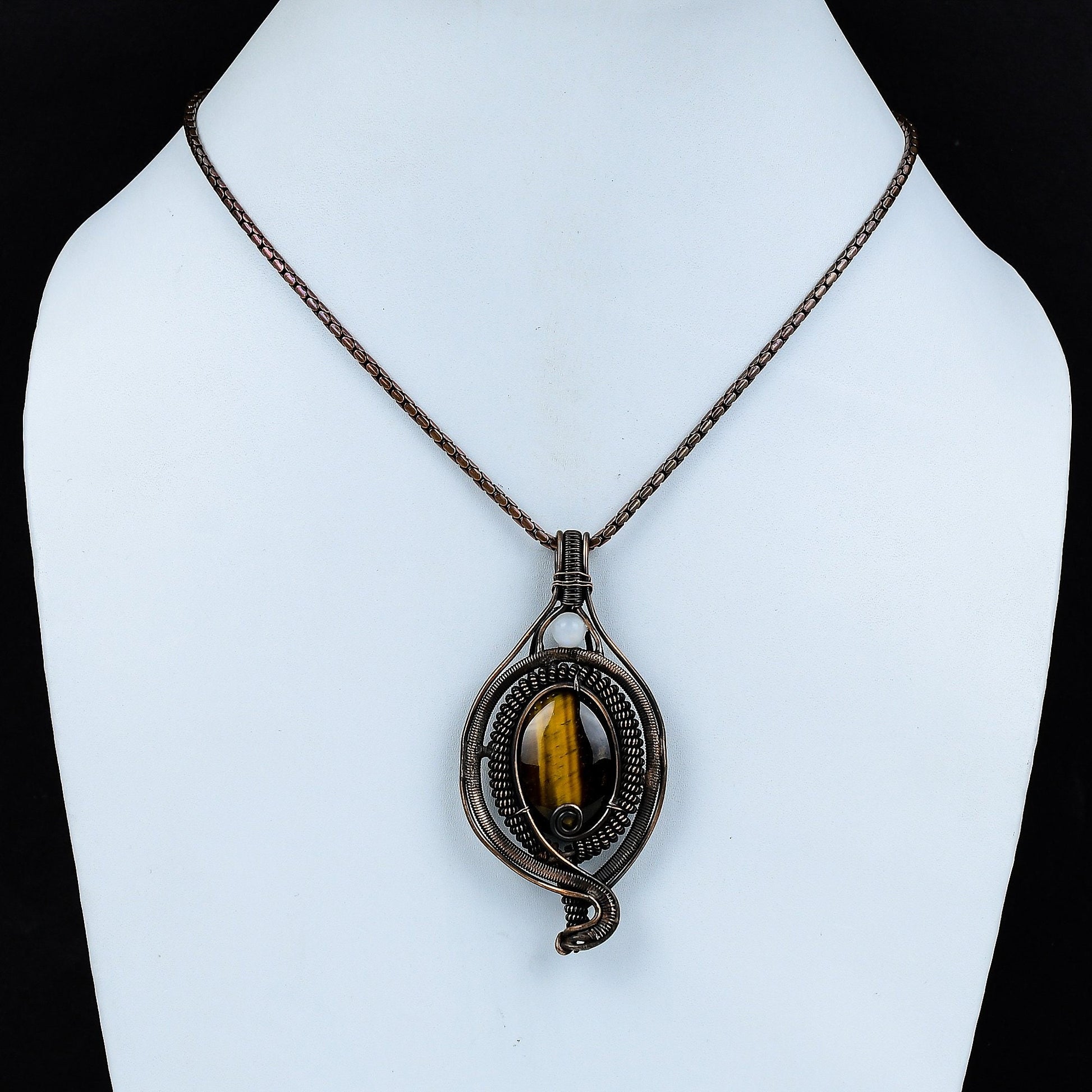 Discover the enchanting allure of our handcrafted Tiger's Eye pendant, skillfully wrapped in antique copper wire. This unique piece emanates a warm, earthy glow that captivates and enchants.