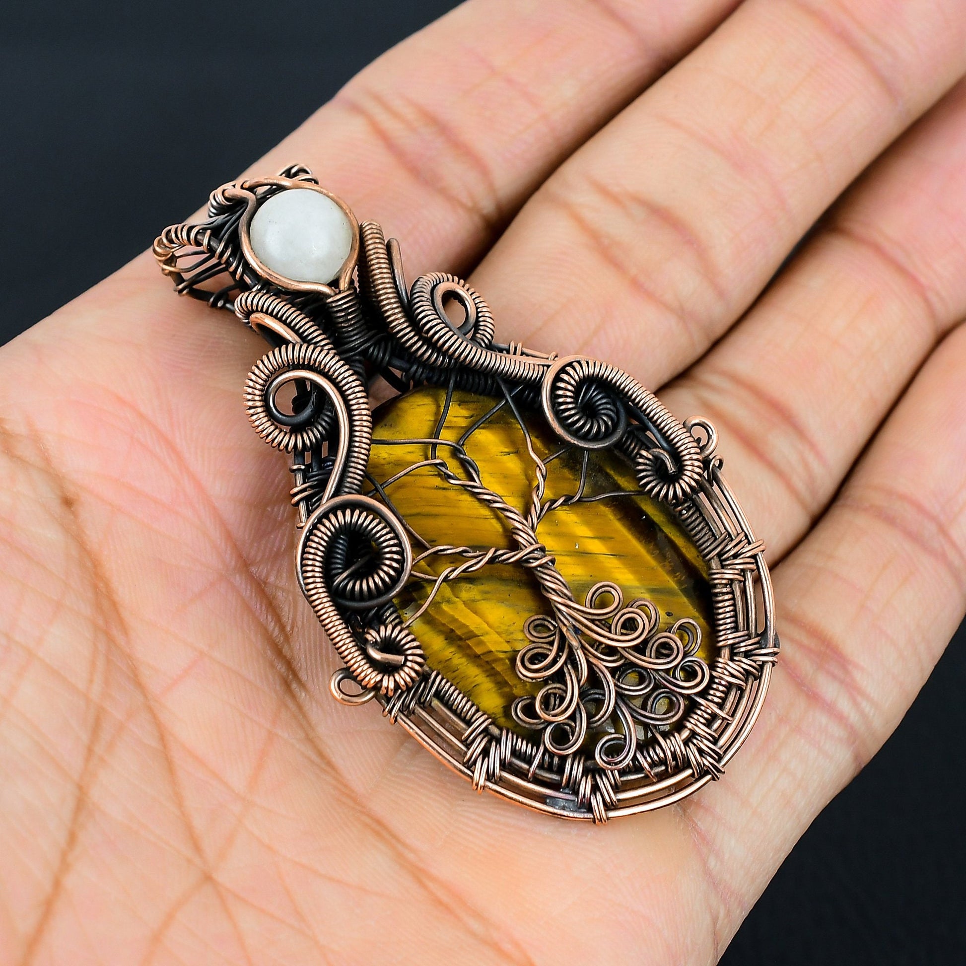 Design: This pendant features a beautiful Tree of Life motif, intricately wrapped in copper wire. The tree rests upon a polished tiger's eye gemstone, known for its grounding and protective properties.