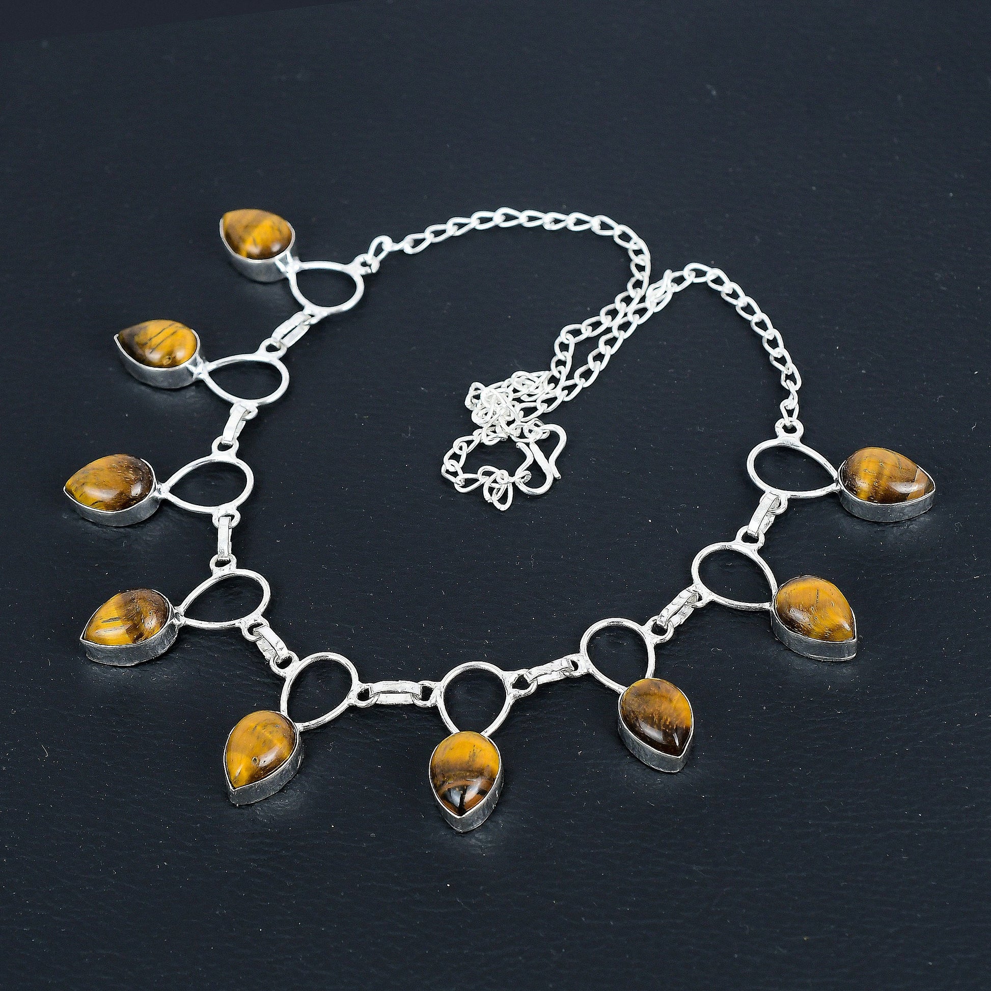 Discover the timeless elegance of our Handcrafted Tiger's Eye Necklace. This exquisite piece features stunning teardrop-shaped Tiger's Eye stones, each encased in sleek, polished metal.