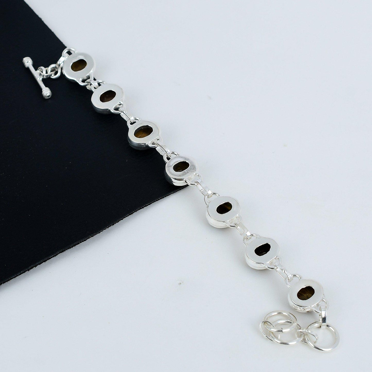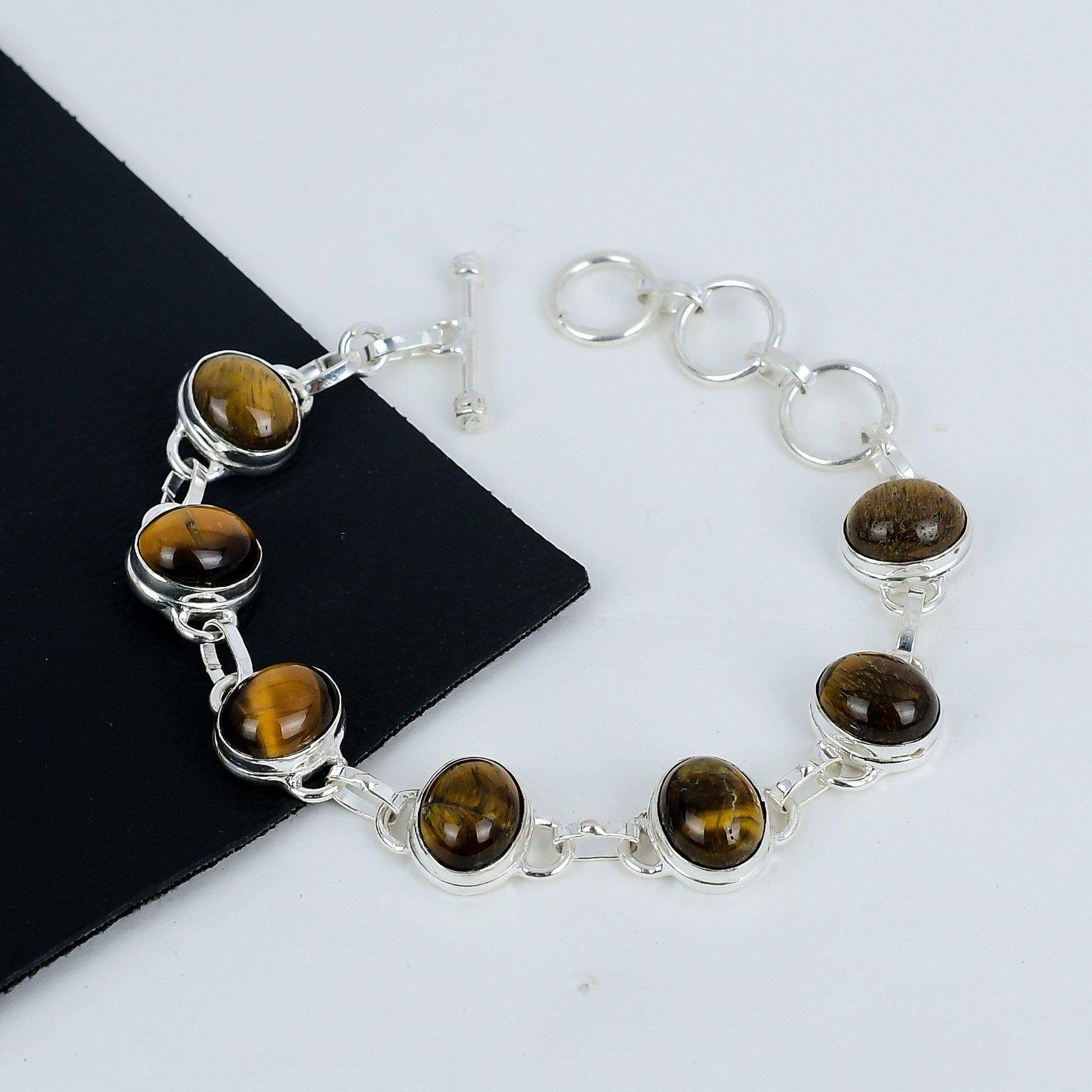 Experience the captivating allure of our exquisite bracelet, elegantly crafted with a striking combination of sterling silver and genuine tiger's eye gemstones.